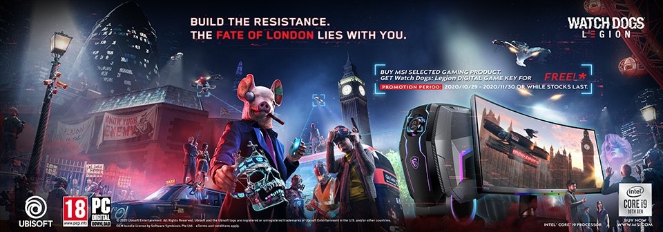 Aktionszeitraum für das MSI-Gamingbundle “BUILD THE RESISTANCE” ist vom 29. Oktober 2020 bis zum 30. November 2020. Gamer, die während dieser Zeit ausgewählte MSI-Gaming-Desktop- oder Monitor-Modelle kaufen, erhalten einen digitalen Produktschlüssel für Watch Dogs: Legion kostenlos.