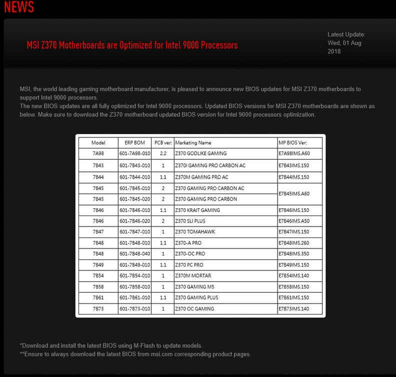 Die Bekanntmachung wurde in der Zwischenzeit, aus welchem ​​Grund auch immer, sofort ausgeführt. Neben der Ankündigung für MSI’s Z370 Motherboards „Optimiert für Intel 9000 Prozessoren“, veröffentlichte das Unternehmen eine Liste von 15 Motherboard-Modellen in seiner Aufstellung, die den Z370-Chipsatz unterstützen, und ein BIOS-Update erhalten, um sie mit Intels 9000-Serie kompatibel zu machen.
