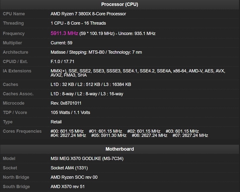 Das MSI OC-Team hat mit dem MEG X570 GODLIKE einen neuen Übertaktungsrekord für die AMD Ryzen 3000 Prozessoren aufgestellt. Dabei wurde bei einem AMD Ryzen 7 3800X 8-Core ein Takt von über 5,9 GHz erreicht. Darüber hinaus konnte auch der bestehende OC-Rekord für DDR4-RAM unter Einsatz einer Flüssigstickstoffkühlung auf nunmehr 5774 MHz angehoben werden.
