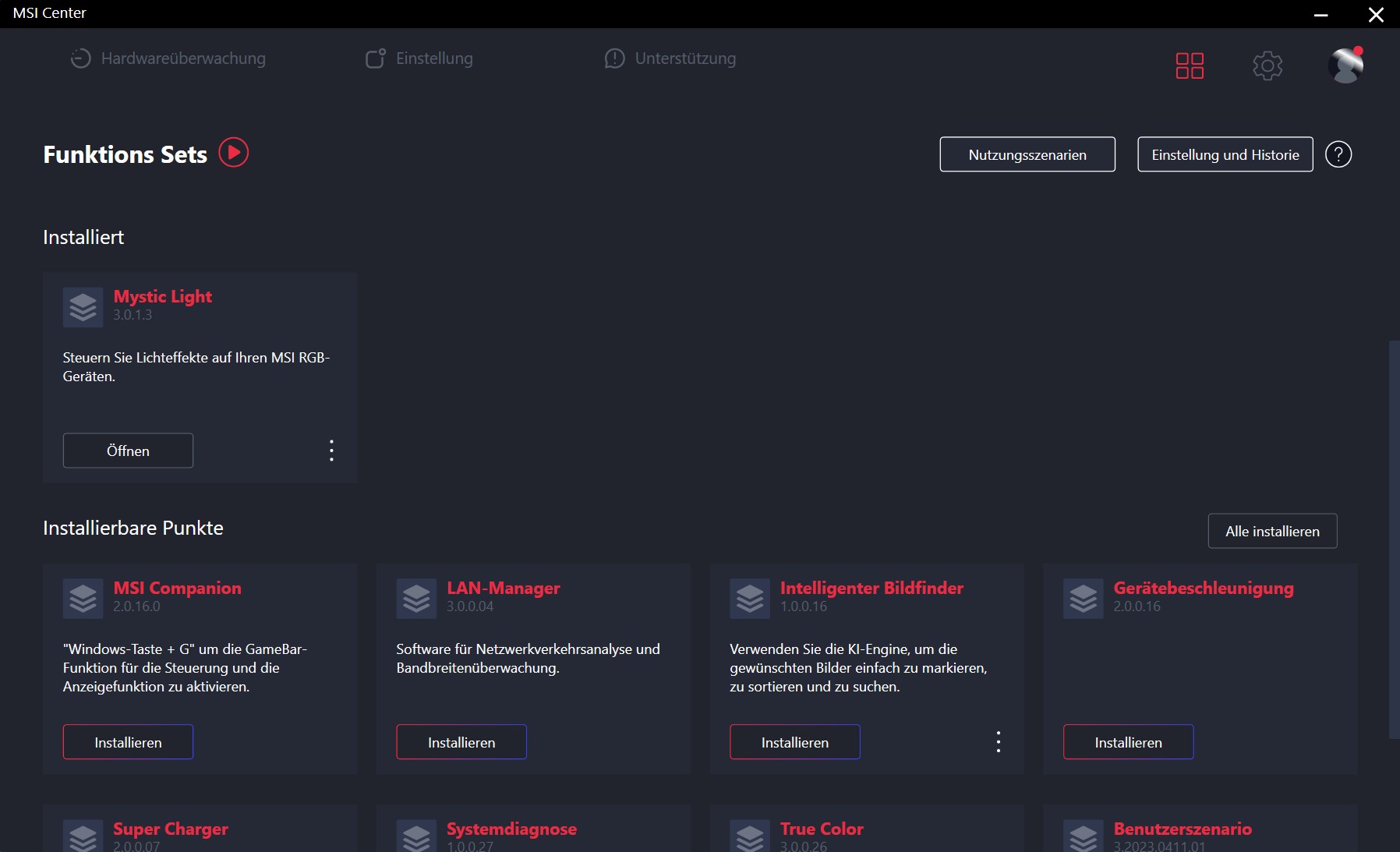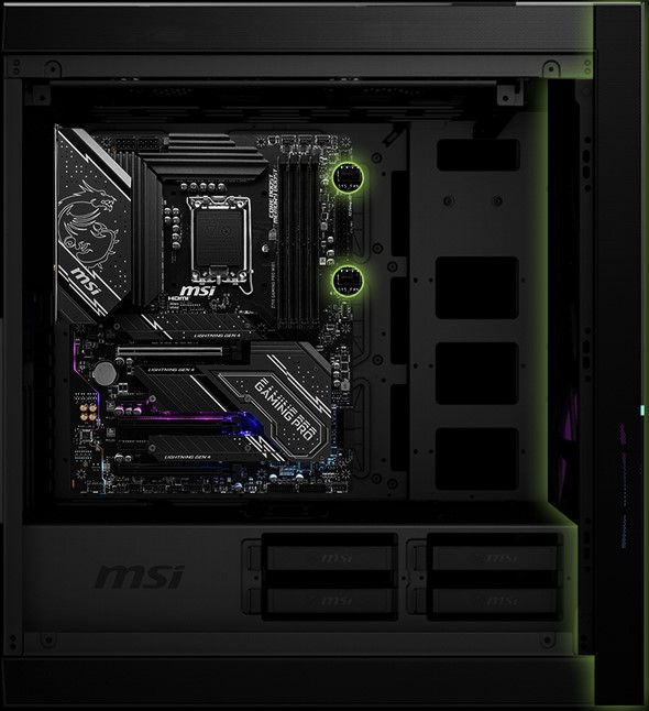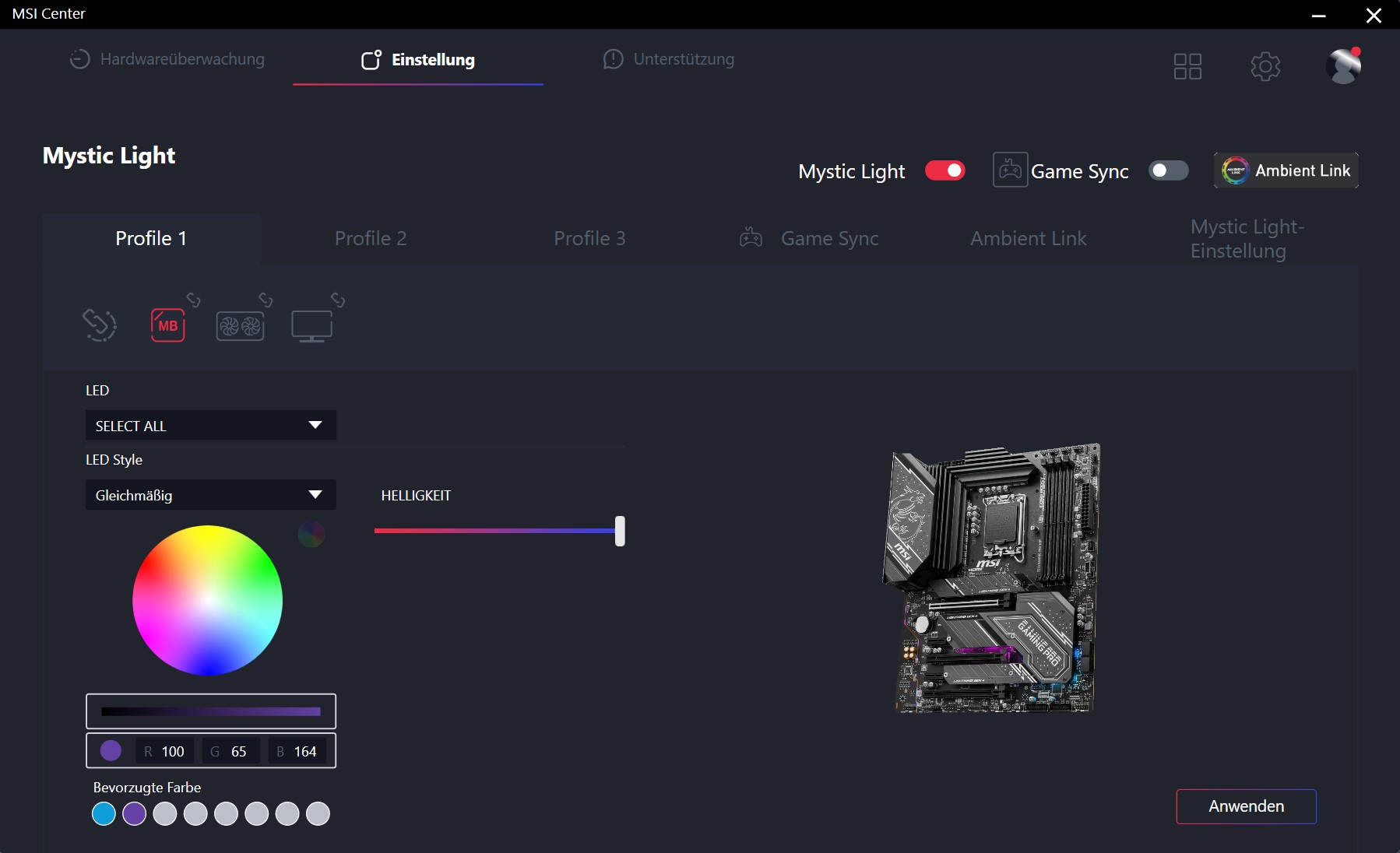 Die Beleuchtung kann über das MSI-Center im Mystic-Light angepasst werden. Mit verschiedenen Profilen und Voreinstellungen wie beispielsweise dem Ambient-Link, kann das ganze System gesteuert werden. Auch in Verbindung mit Drittanbieter-Software wie Armoury Crate oder ICUE können die Softwarelösung mit den richtigen Einstellungen koexistieren.
