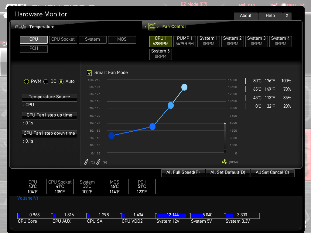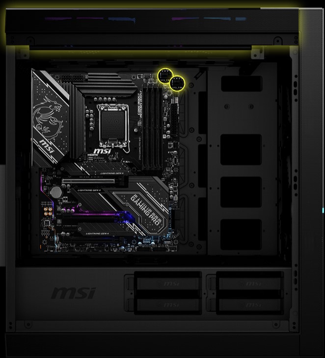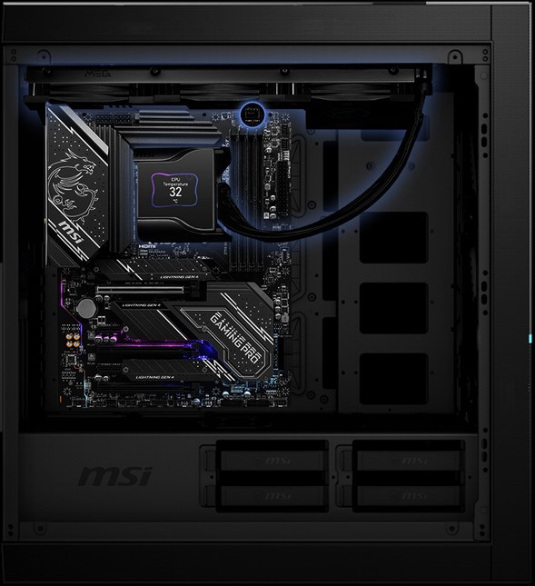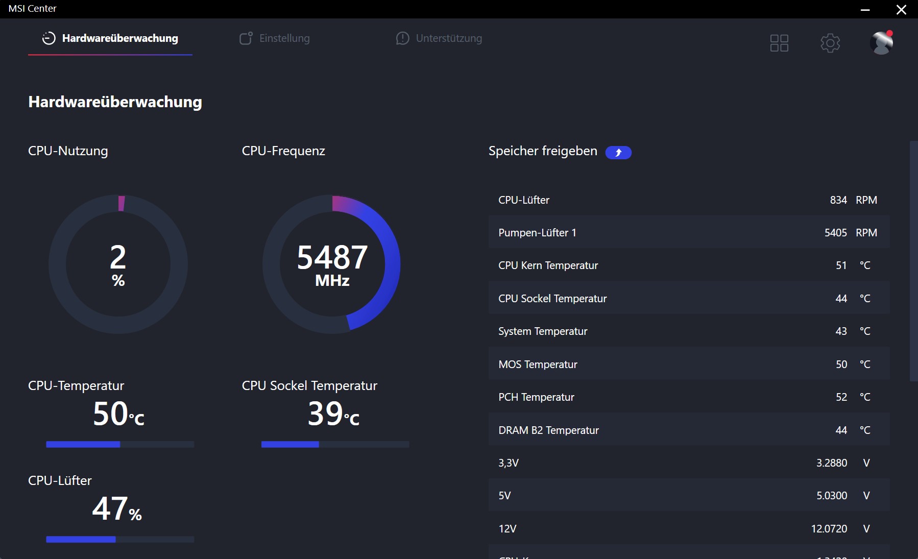 Bei der Lüftersteuerung schafft wieder die Steueroberfläche im BIOS Abhilfe. Mit der einfachen Grafikoberfläche können bis zu vier Temperaturziele gewählt werden, bei denen die Lüftergeschwindigkeiten automatisch angepasst werden. Weiterhin ist die Lüftersteuerung auch softwaretechnisch im MSI-Center möglich. Dabei bietet die FROZR AI Cooling Engine eine automatische Kühlung durch Messungen der Temperatur an verschiedenen Stellen im Gehäuse an. So erkennt das System automatisch in welchem Modus die Lüfter betrieben werden und sorgt für eine optimierte Abstimmung der Lüftergeschwindigkeiten. Durch eine entstehende Hysterese drehen die Lüfter gleichmäßig, sodass das System immer leise bleibt. Die Lösung durch die Wasserkühlung in Form einer AIO ist ein spezieller Pin montiert, der bis zu 3 Ampere ermöglicht, um die volle Kontrolle über die Wasserpumpe zu erhalten. Hierbei ist volle Unterstützung durch die Marken MSI, Bitspower, Cooler Master, Corsair, ekwb und Thermaltake versprochen.