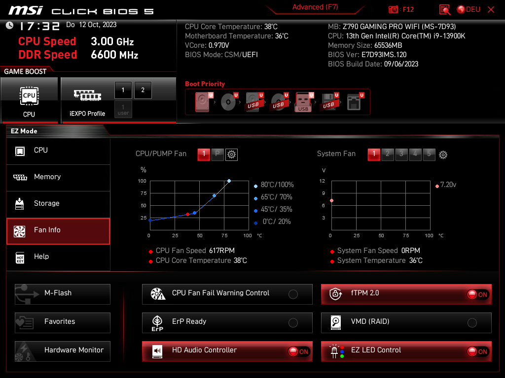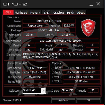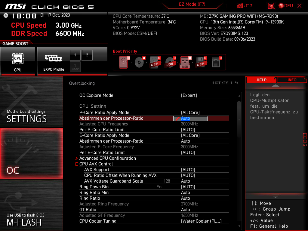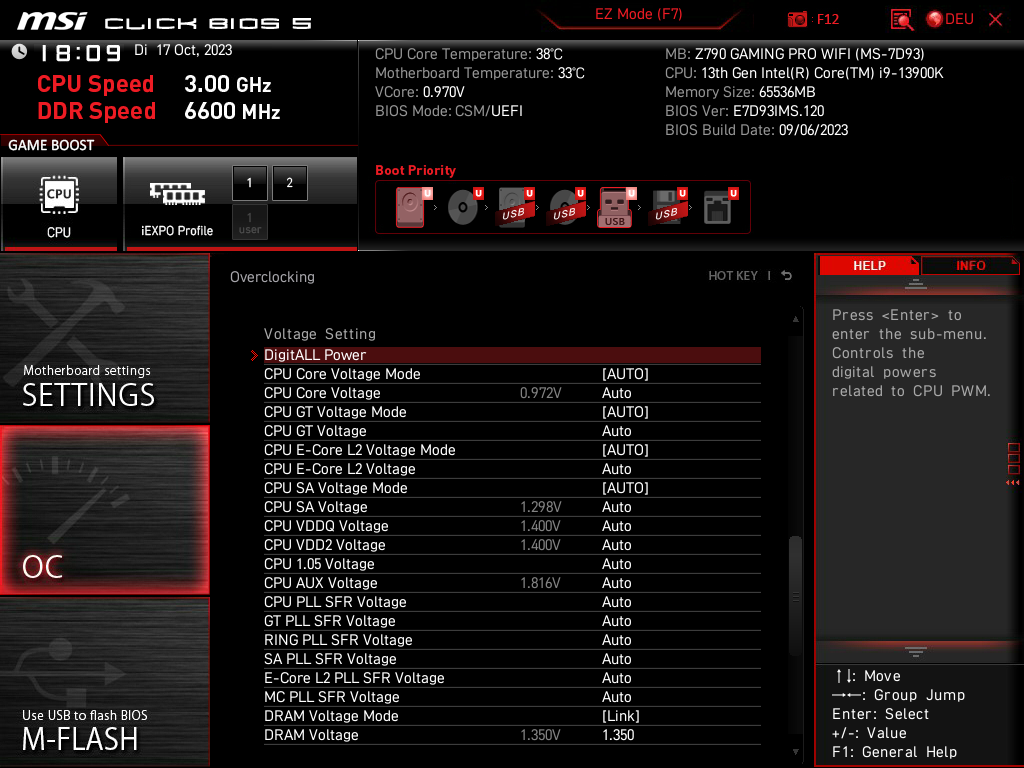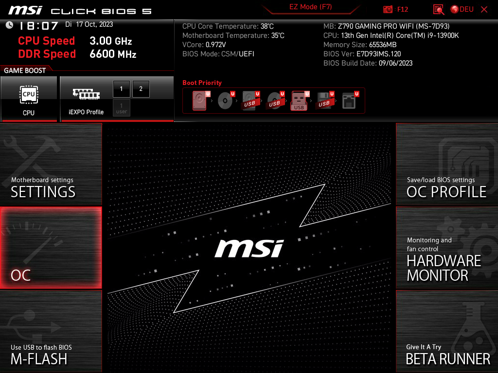 In der Praxis unterstützt das MSI Z790 GAMING PRO WIFI Intel Core Pentium, Gold und Celeron Prozessoren der 12. und 13. Generation für den LGA 1700 Sockel. Der DDR5-Speicher wird bis zu einer Taktrate von 7.200 MHz im Overclocking unterstützt, wobei wir den CORSAIR DOMINATOR TITANIUM mit einer Taktrate von 6.600 MHz ausreizen. Im Vergleich dazu unterstützte die Z690 Reihe nur bis zu 6.400 MHz. Obwohl die RAM-Speicher für AMD ausgelegt sind, kann dieser auch problemlos auf einer Intel-Plattform betrieben werden. Hierbei sollten die RAM-Einstellungen im BIOS aber von Hand durchgeführt werden, was nur für erfahrene Benutzer zu empfehlen ist. Das BIOS bietet sehr viele Anpassungsmöglichkeiten, die hauptsächlich Enthusiasten ansprechen. Für Durchschnittsverbraucher ist das Angebot an Einstellungen mehr als ausreichend. Am Rande sei erwähnt, dass auch hier ein Übertakten des Prozessors sowie Arbeitsspeichers möglich ist. Die Einstellungen der Taktraten und Spannungen und Ströme sind für Nutzer, die genau wissen, was sie tun. Mit dem aktuellen BIOS-Version 7D93v12 wollen wir uns weiterhin anschauen, wie das System auf ein Overclocking des RAM-Speichers reagiert.