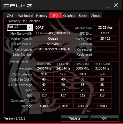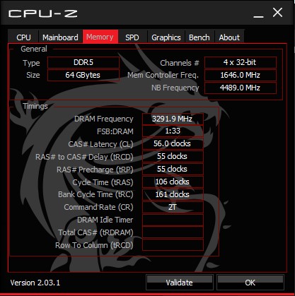 Durch die Möglichkeiten, welche uns das Mainboard bietet, schaffen wir es den von uns genutzten Arbeitsspeicher bei 1,35 Volt auf bis zu 7.000 MHz zu übertakten. Dabei handelt es sich um zwei Riegel des „CORSAIR DOMINATOR TITANIUM FIRST EDITION“, welcher vom Hersteller mit 6.000 MHz angegeben ist. In den folgenden Tests hat sich herausgestellt, dass das System am stabilsten mit einer Arbeitsspeicher-Taktrate von 6.600 MHz funktionierte.