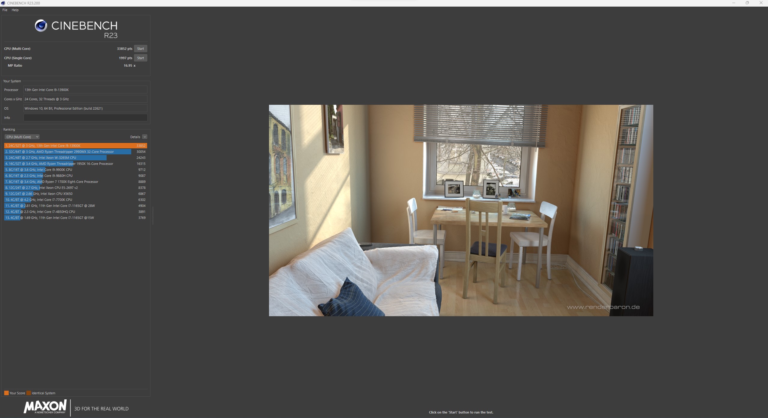 Zuerst haben wir das System mit der Software Cinebench R23 getestet. Im ersten Schritt ließen wir Cinebench in Single Core Modus laufen und erhielten dabei eine Punktzahl von 1997. Anschließend ergab Cinebench im Multicore Modus eine Punktzahl von 33852. In der Vergleichstabelle sind die Systeme zu den einzelnen Tests nach Punkten gelistet.