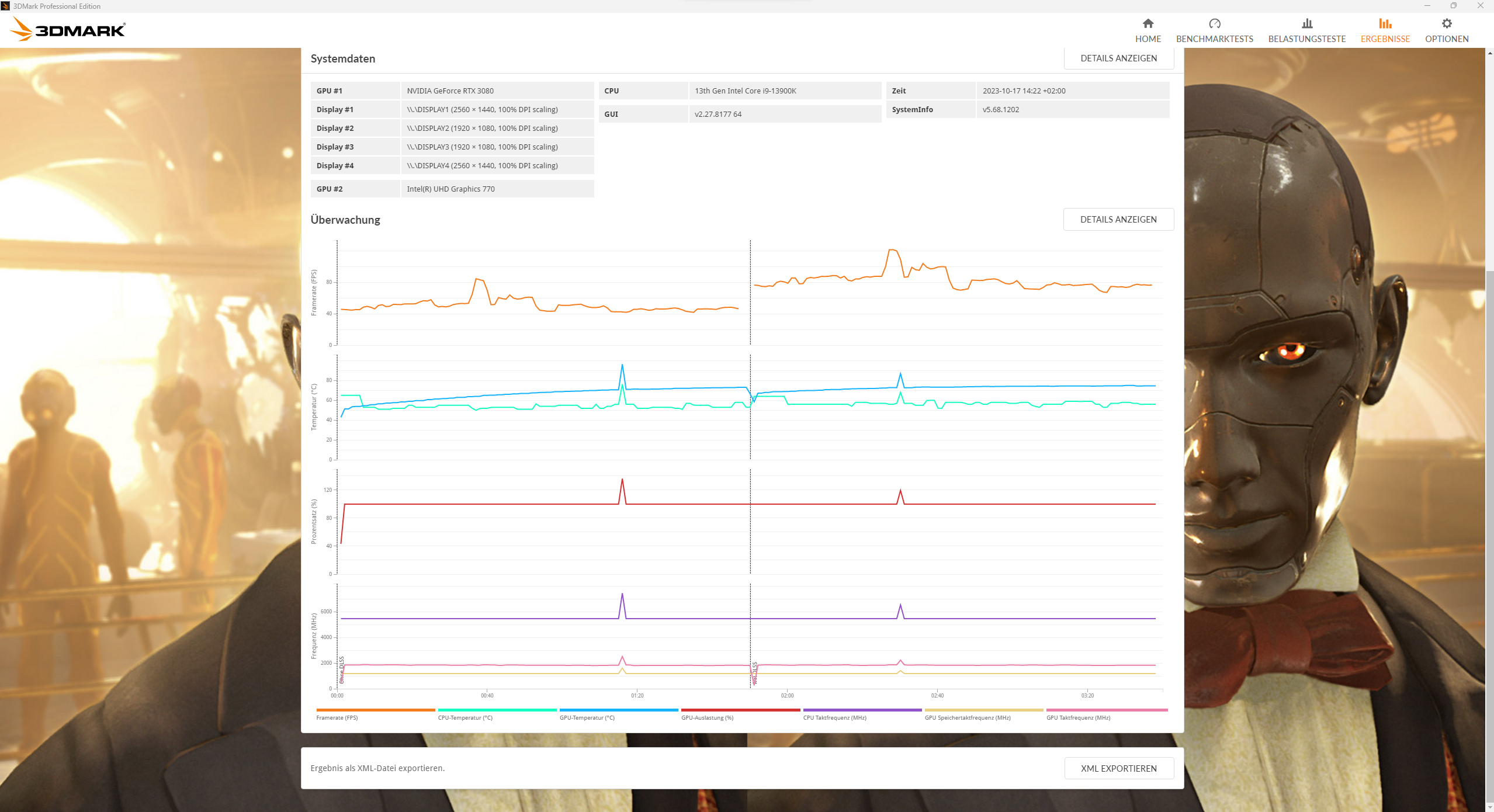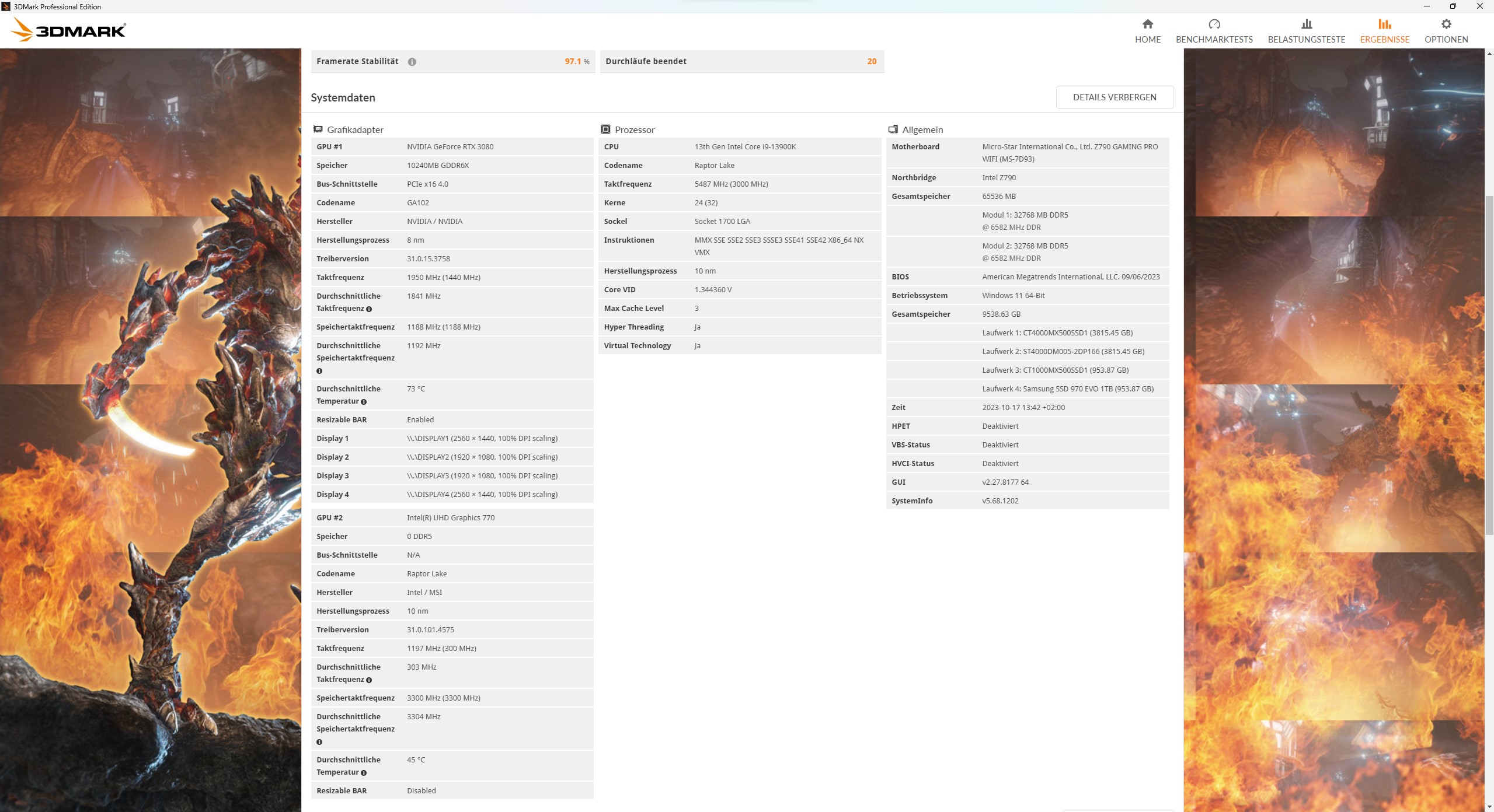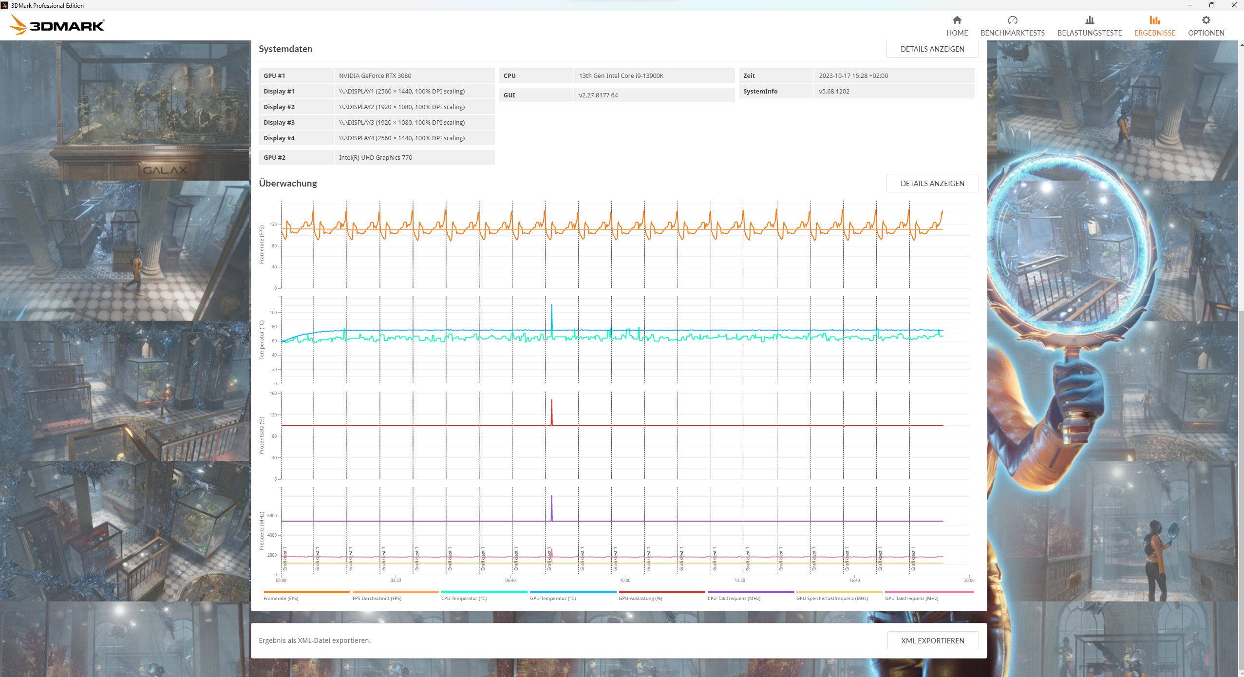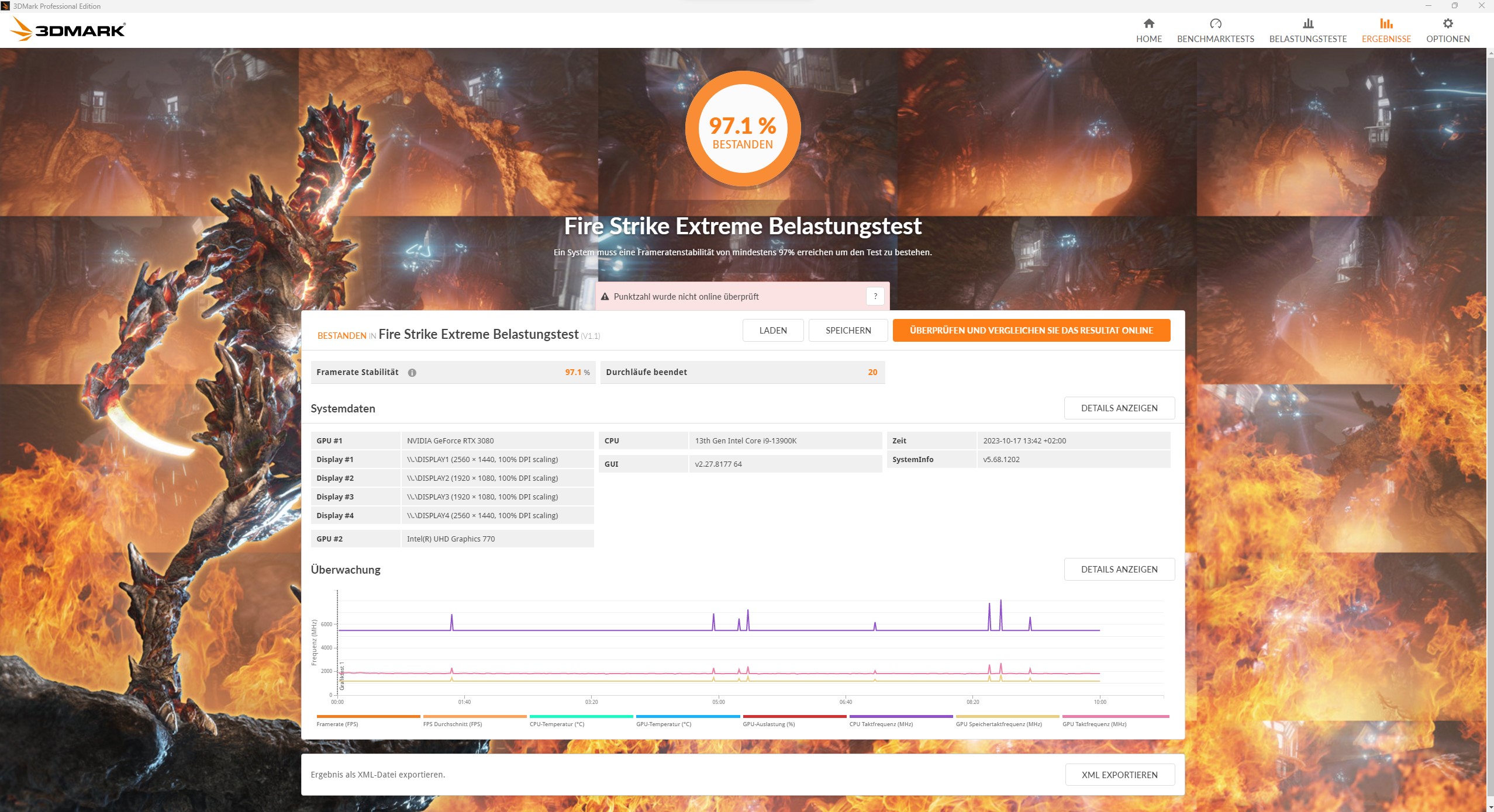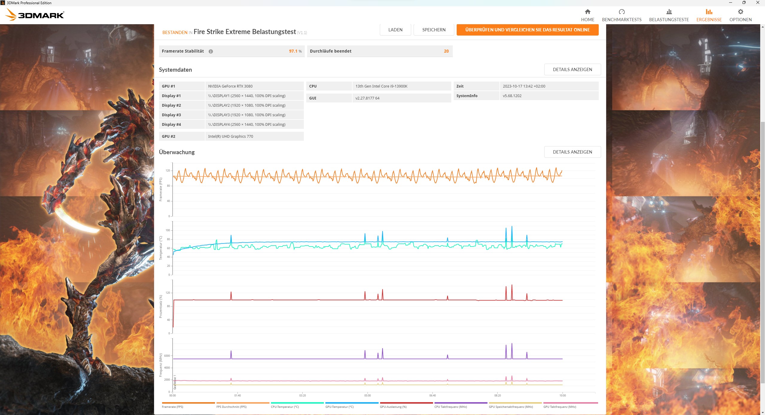Der Fire Strike Extreme Belastungstest liefert uns eine Framerate Stabilität von 97,1 % bei 20 Durchläufen. Die Details zur Überwachung können den Diagrammen im Endergebnis nachvollzogen werden.