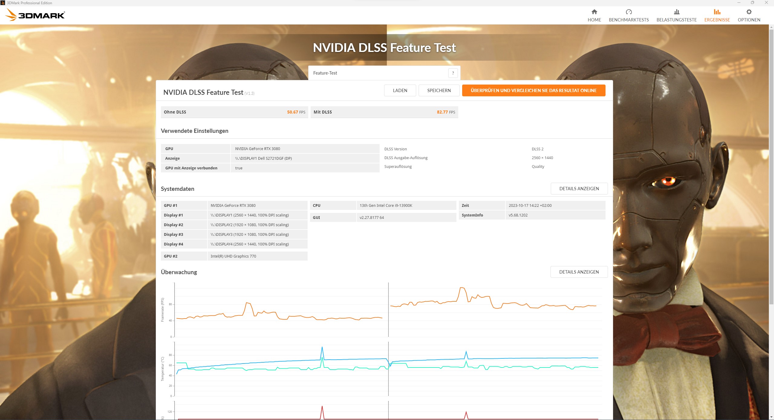 Der DLSS Feature Test zeigt uns den Unterschied zwischen den FPS Werten mit aktiviertem und deaktiviertem DLSS. Dabei betrug der Wert ohne DLSS 50,67 FPS, wobei ein Wert von 82,77 FPS bei aktiviertem DLSS erreicht werden konnte. Auch hier kann der Verlauf des Tests den Diagrammen entnommen werden.