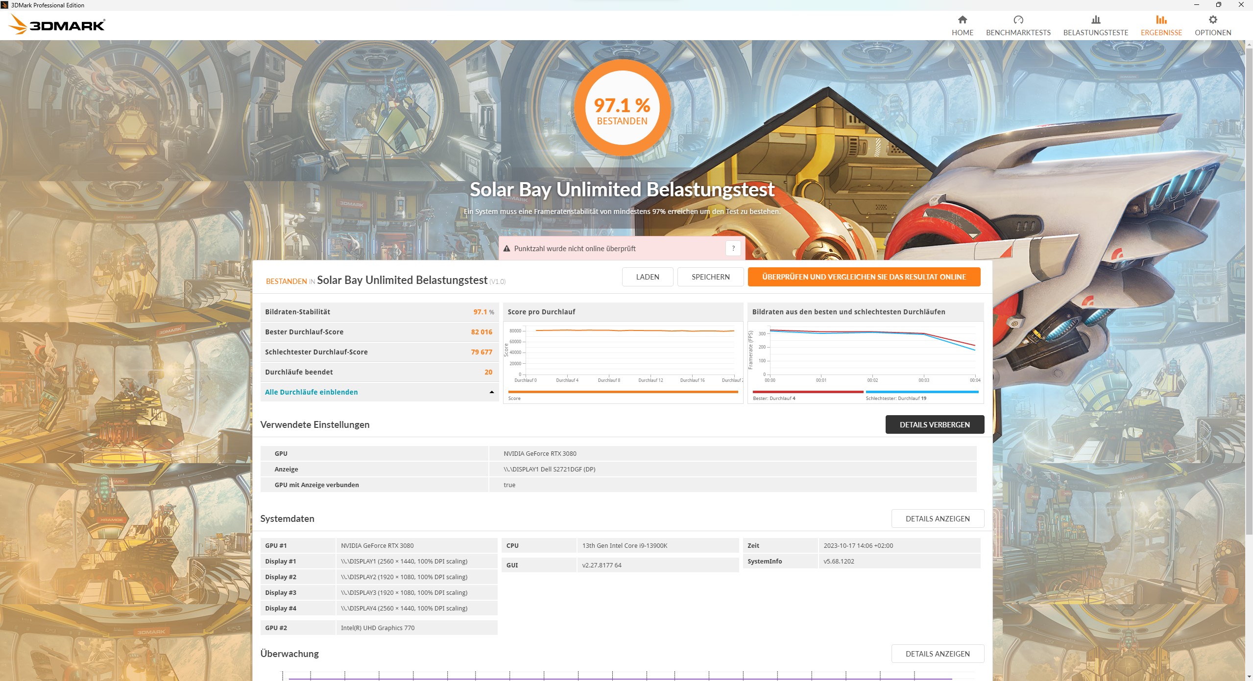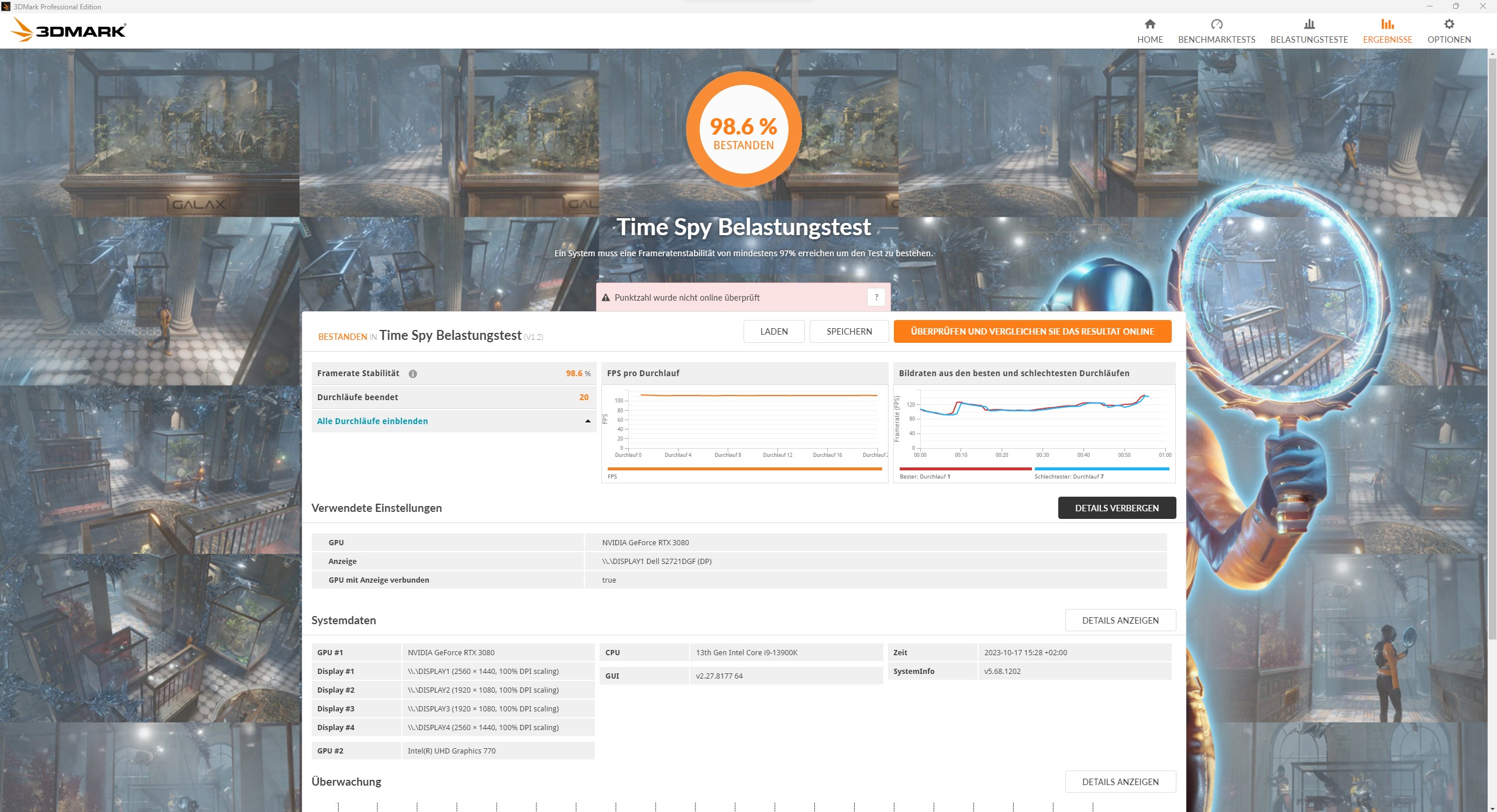 Den ersten Test mit Time Spy hatten wir nicht bestanden, da noch einige Programme im Hintergrund liefen. Anschließend haben wir sämtliche Programme im Hintergrund deaktiviert und den Test mit 20 Durchläufen erneut gestartet. So konnten wir den Belastungstest mit 98,6 % bestehen.