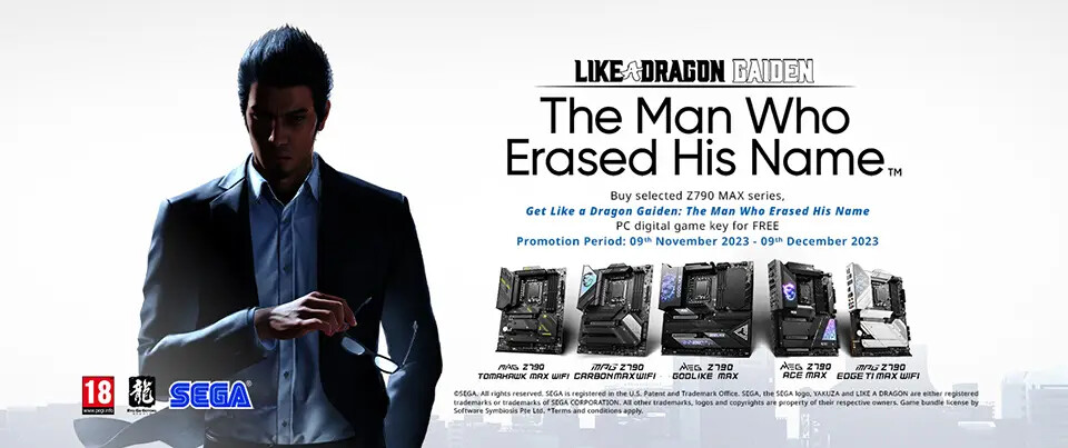 Vom 09. November bis zum 09. Dezember 2023 erhalten Käufer eines ausgewählten Motherboards der Z790 MAX Serie einen Code für das Spiel Like a Dragon Gaiden: The Man Who Erased His Name gratis dazu. Verpasse nicht die Gelegenheit, dein Gaming-System mit dem Z790 MAX Series-Motherboard von MSI aufzurüsten und „Like a Dragon Gaiden: The Man Who Erased His Name“ ohne zusätzliche Kosten zu erleben. Da nur eine begrenzte Menge verfügbar ist, solltest du schnell handeln, um dir dein Bundle zu sichern und deine Gaming-Reise mit Stil anzutreten. Dieses exklusive Bundle ist ein zeitlich begrenztes Angebot, also markiere deinen Kalender und sei bereit, diese Gelegenheit vom 09. November bis zum 09. Dezember 2023 zu nutzen.
