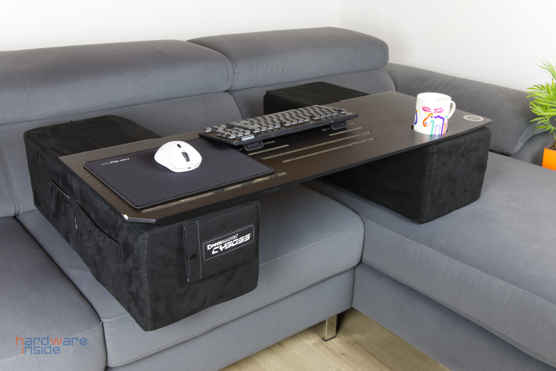 Im Grunde findet bei der nerdytec Couchmaster Cyboss kein wirklicher „Aufbau“ statt. Die zwei Kissen werden auf die Couch gelegt, die Auflagefläche kommt oben drauf und die restliche Ausstattung kann ihren Platz finden. Dann gilt es nur noch, irgendwie zwischen die Kissen unter die Auflagefläche zu gelangen. Mit etwas Flexibilität und vorherigem Dehnen, ist das auch ohne Probleme möglich. Alternativ lassen sich auch sicher weniger sportliche Methoden finden.