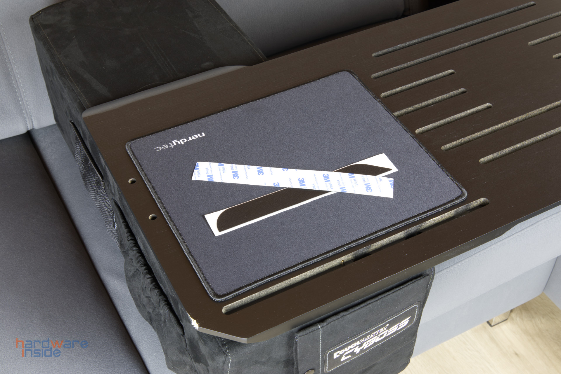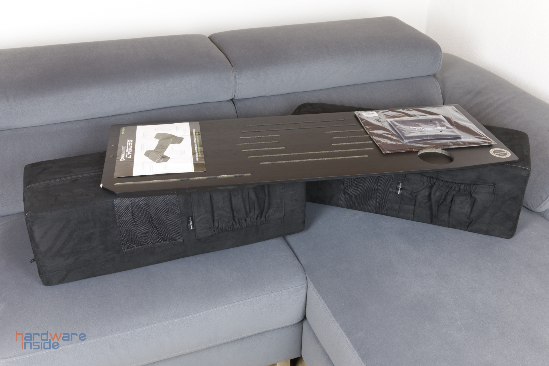 Der nerdytec Couchmaster Cyboss, besteht aus zwei Kissen und einem Auflagebrett aus Bambus. Zusätzlich liegen ein Mauspad, zwei zu verklebende Auflagen für den Arm, sowie eine kurze Anleitung bei. Auf der Vorderseite eines der beiden Kissen kann eine Tasche aufgeklebt werden, worin sich laut Hersteller optimal eine Maus verstauen lassen soll. In einem gefrästen Schlitz kann ein Tablet eingesteckt werden, zur besseren Positionierung liegt ein Stück Kunststoff bei.