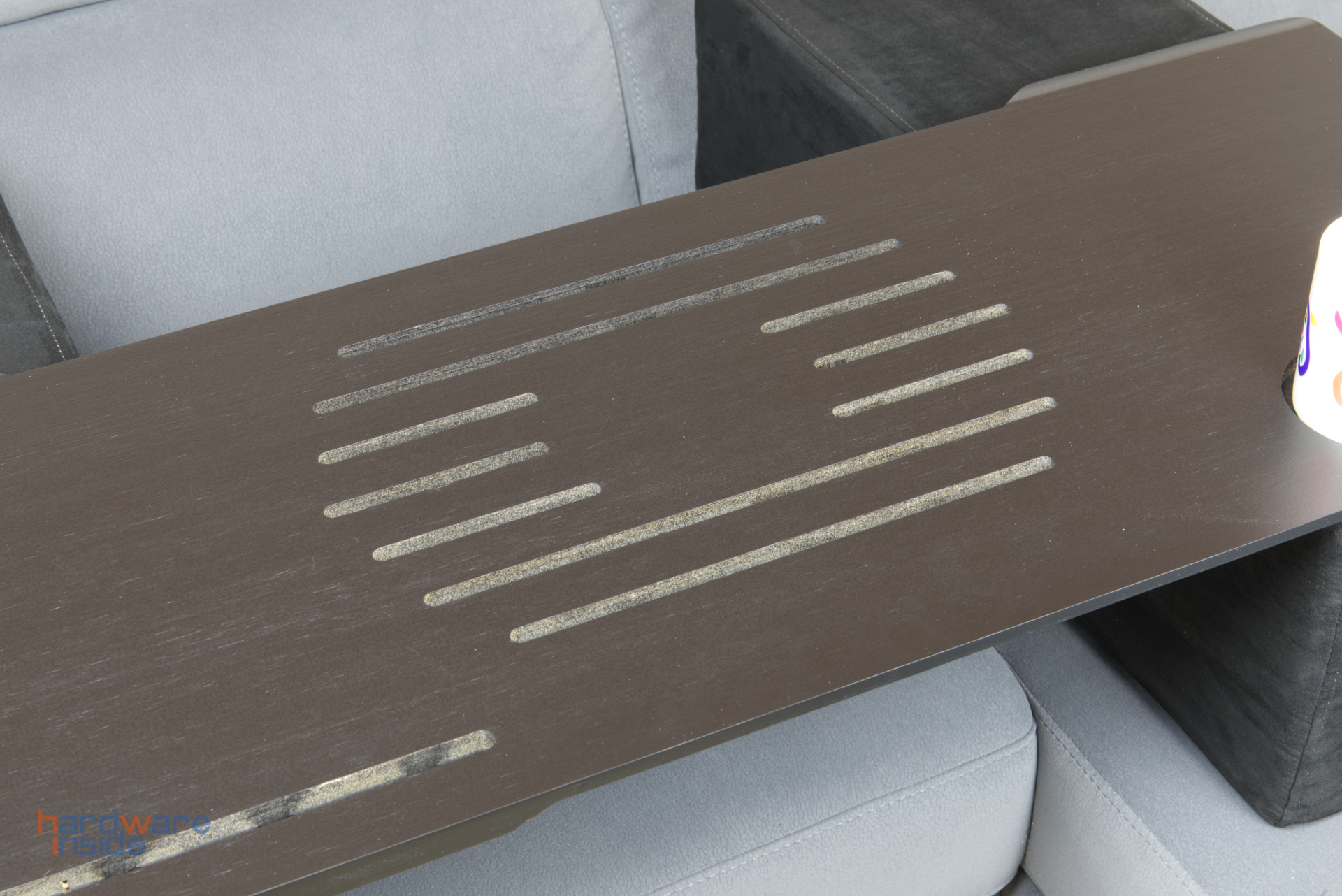 Die Auflage aus Bambus ist mit 100 x 39,3 cm groß genug, um auch über 15 Zoll großen Notebooks genug Fläche bieten zu können. Mittig eingefräst wurden Bahnen, die eine bessere Kühlung (Abluft) des Notebooks unterstützen sollen. Sitzt man zwischen den Kissen und unter der Auflage, befindet sich oben rechts ein Schlitz, in den ein Tablet gesteckt werden könnte (auf dem Bild unten links). Das ist eine überaus gute Idee des Herstellers, die Umsetzung selbst lässt indes zu wünschen übrig – die Innenkanten werden nicht durch Filz oder andere Materialien geschützt, weshalb hochpreisige Tablets nicht einfach eingesteckt werden sollten. Wird dennoch ein Tablet eingesteckt, kann dieses durch eine beiliegende Scheibe aus Kunststoff stabilisiert werden.