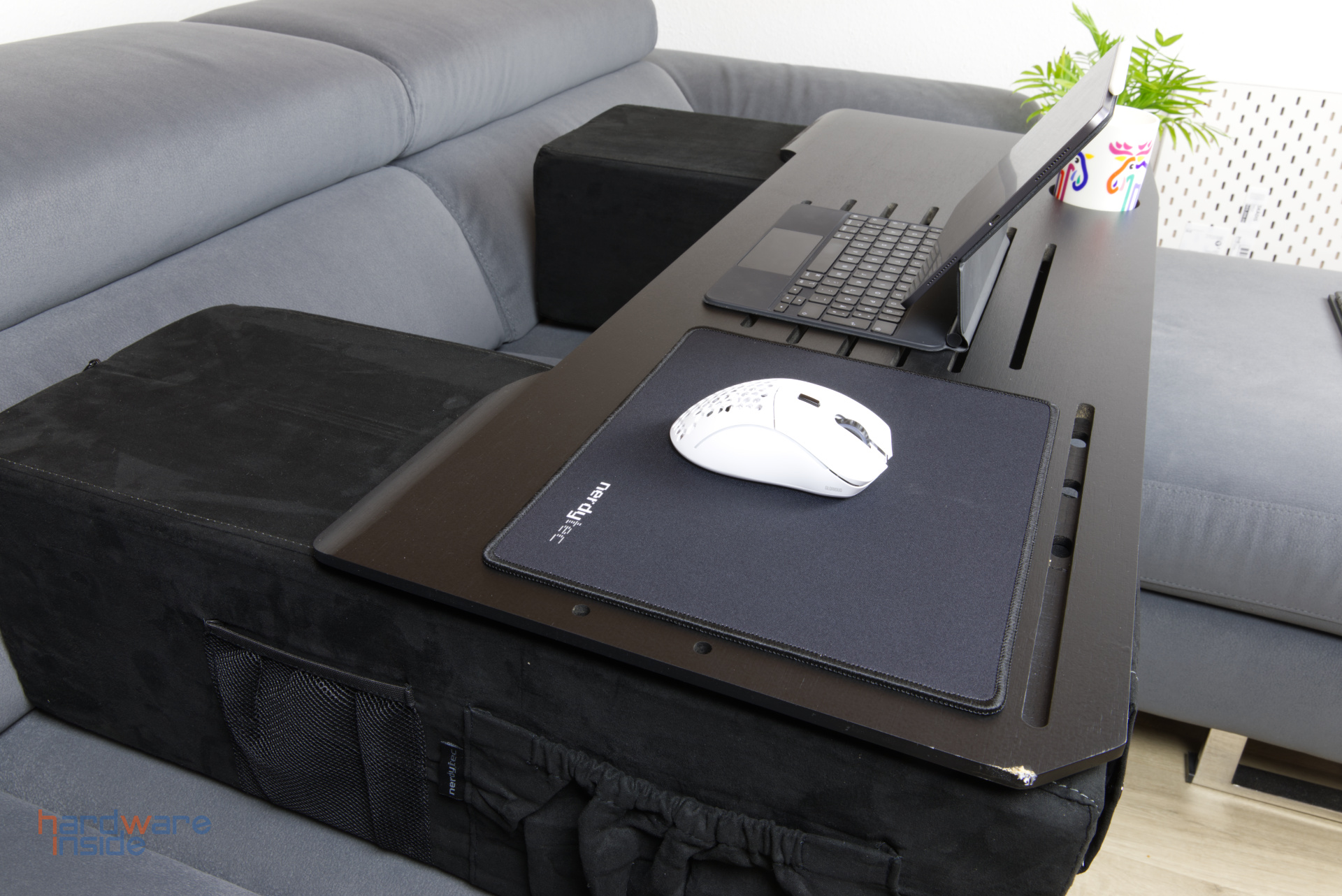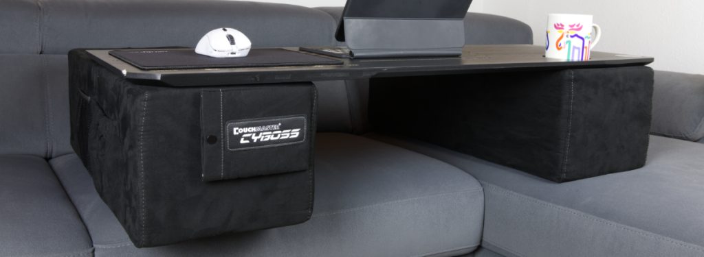 Im Grunde findet bei der nerdytec Couchmaster Cyboss kein wirklicher „Aufbau“ statt. Die zwei Kissen werden auf die Couch gelegt, die Auflagefläche kommt oben drauf und die restliche Ausstattung kann ihren Platz finden. Dann gilt es nur noch, irgendwie zwischen die Kissen unter die Auflagefläche zu gelangen. Mit etwas Flexibilität und vorherigem Dehnen, ist das auch ohne Probleme möglich. Alternativ lassen sich auch sicher weniger sportliche Methoden finden.