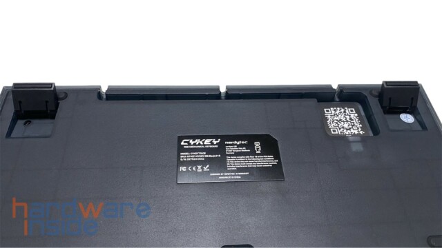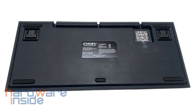 Damit das Anschlusskabel nicht stört, ist die USB-TYP-C-Buchse in einer quadratischen Vertiefung untergebracht. So kann dann das Kabel durch die Kabelführung passend durch eine der drei Auspaarungen nach außen verlegt werden. Ein QR-Code in der quadratischen Vertiefung leitet direkt auf die CYKEY Support Webseite von nerdytec. Hier können die neuste Firmware, die Tastenbelegungen für VIA und das QMK Firmware Tool heruntergeladen werden. Neben dem QR-Code ist mittig auf der Rückseite noch ein Typenschild in Form eines schwarzen Aufklebers angebracht.