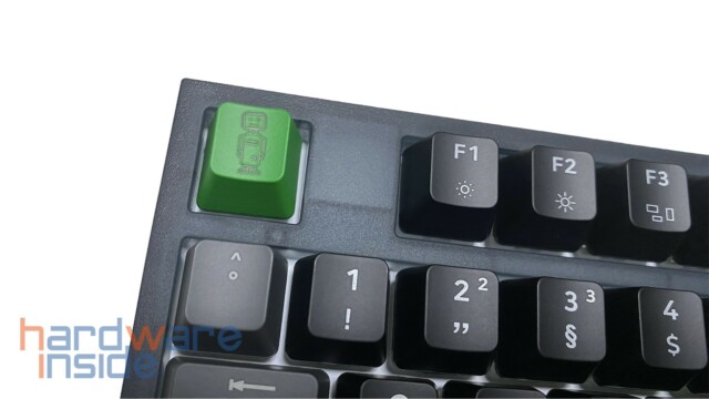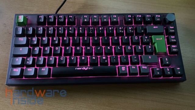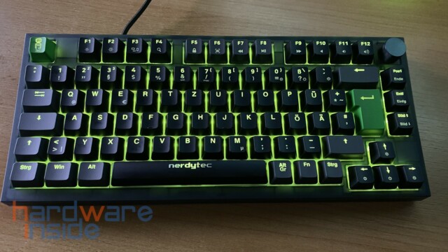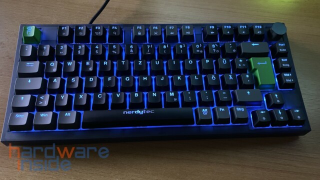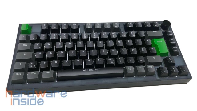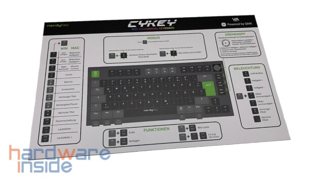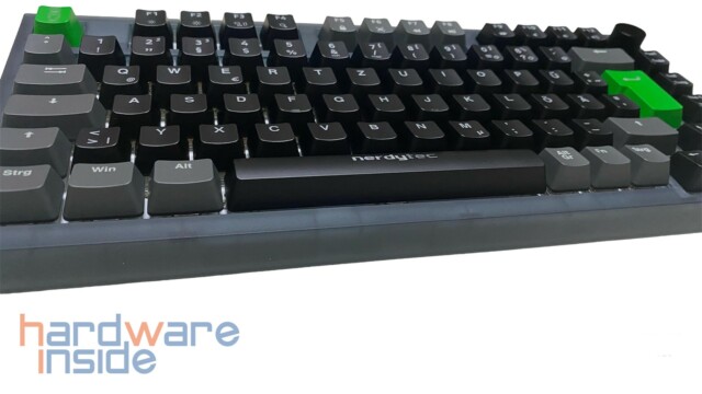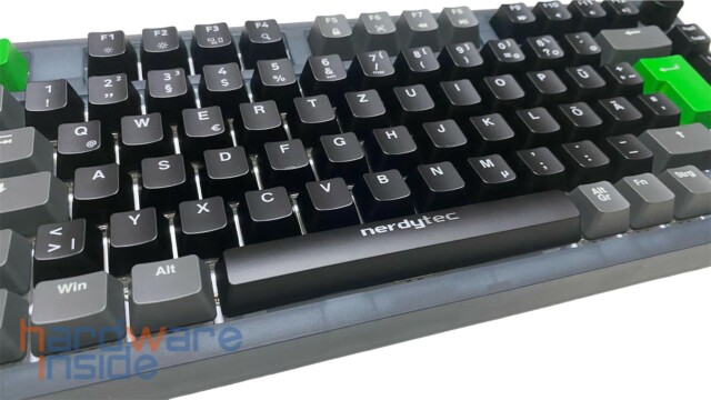 Das ISO-Tastaturlayout besitzt ein modernes Design mit grauen und schwarzen Tasten und wird durch eine grüne Escape-Taste mit dem nerdytec Maskottchen sowie einer ebenfalls grünen Enter-Taste optisch aufgewertet. Die Leertaste ist mit einem nerdytec Schriftzug versehen. Beide grünen Tasten lassen sich allerdings auch durch zwei graue Tasten aus dem Lieferumfang tauschen. Da die CYKEY auch an einem Mac betrieben werden kann, liegen noch fünf zusätzliche Tasten mit Mac-Beschriftung im Lieferumfang bei.