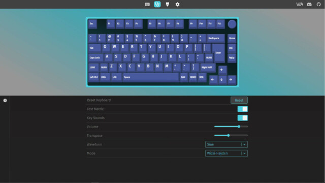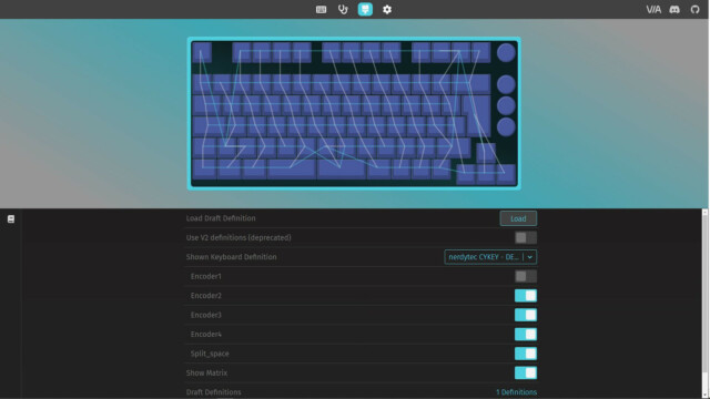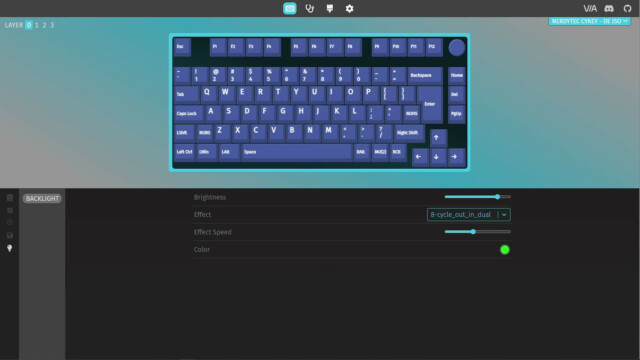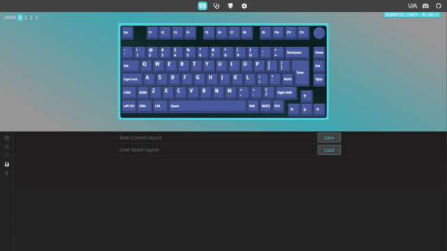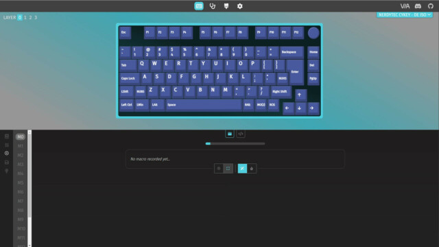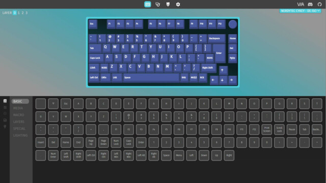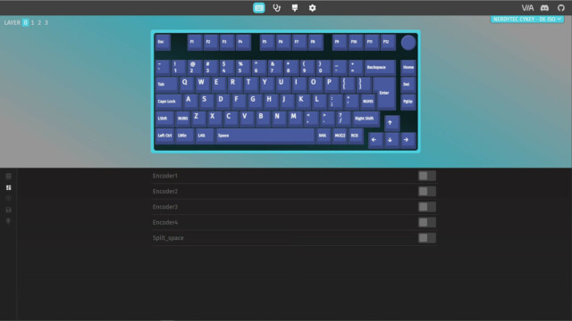Für die grundlegenden Funktionen und die Beleuchtung benötigt die CYKEY keine zusätzliche Software. Alle Funktionen sind in der Anleitung erklärt und auch direkt über die CYKEY steuerbar. Um die CYKEY genauer zu konfigurieren, hat nerdytec keine eigene Software entwickelt, sondern nutzt hier eine webbasierte Open Source Variante. Durch QMK (Quantum Mechanical Keyboard) und VIA lässt sich jede Taste einer Tastatur neu zuwiesen und so quasi eine eigene Firmware erstellen. Dieser Ansatz gefällt uns sehr gut, da das System nicht mit einer weiteren Software belastet wird, die evtl. auch zu Problemen führen kann. Stattdessen erfolgt die Konfiguration intuitiv online im Browser (usevia.app) und bietet so eine maximale Flexibilität. Dafür muss zunächst die aber die CYKEY gekoppelt, dann die Tastatur-ISO von der nerdytec Support-Webseite heruntergeladen und in der App hochgeladen werden. Dann kann es auch schon losgehen mit der Konfiguration.
