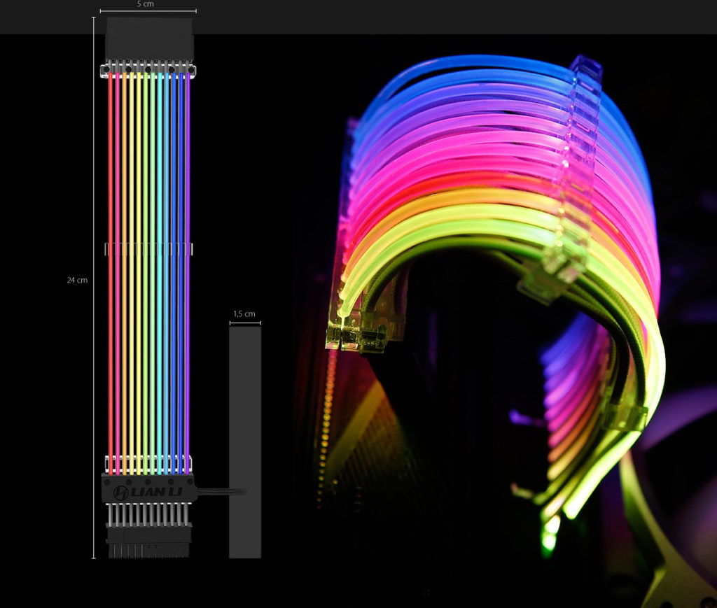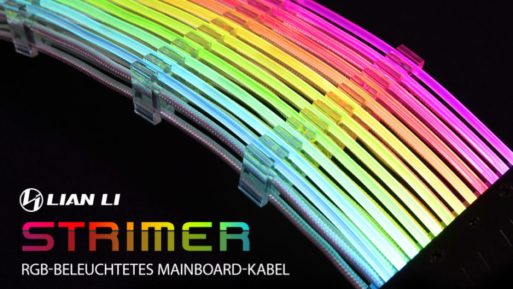 Berlin, 10.07.18) Der Gehäusespezialist Lian Li präsentiert mit dem Strimer 24-Pin RGB Mainboardkabel ein einzigartiges RGB-Produkt, das die letzte Lücke bei den RGB-beleuchteten Komponenten schließt. Jede sichtbare Ader des Anschlusskabels wird durch zwölf einzeln adressierbare RGB-LEDs individuell beleuchtet, wodurch besonders farbenfrohe und beeindruckende Beleuchtungseffekte kreiert werden können. Die Steuerung erfolgt wahlweise über den im Lieferumfang enthaltenen Controller oder ein kompatibles Mainboard mit digitalem 3-Pin-RGB-Header. Jetzt bei Caseking.