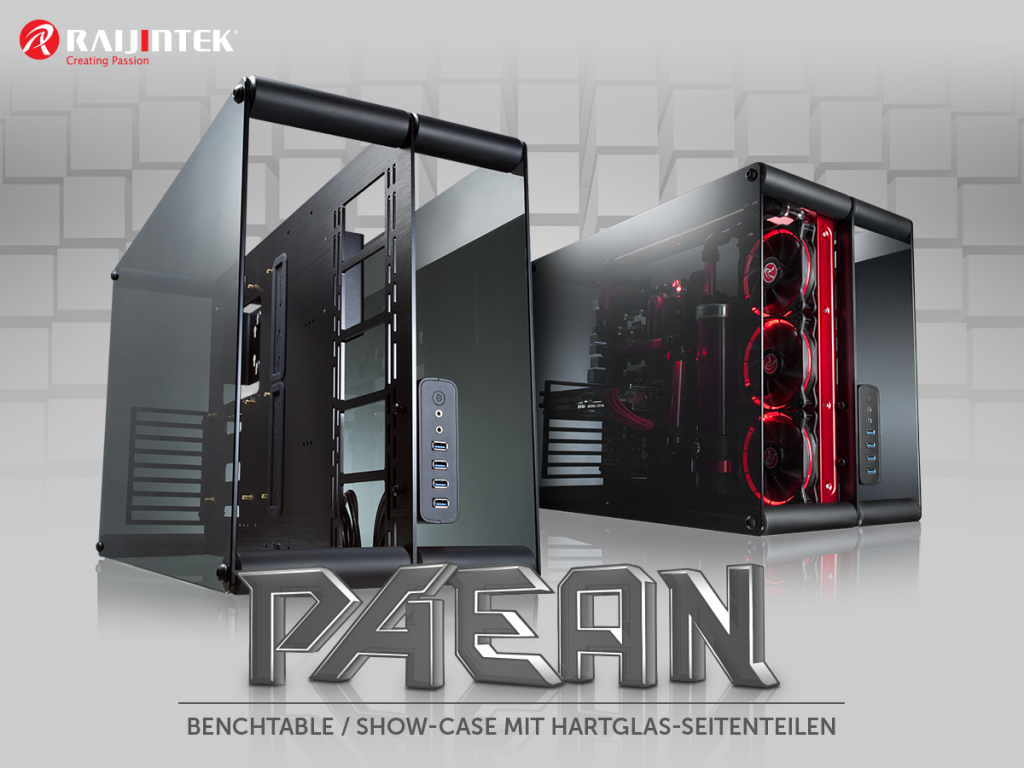 Berlin, 17.11.2016 – Mit dem Paean setzt Raijintek nun auch im Segment der Benchtables bzw. Showcases ein Ausrufezeichen. Das besonders schicke, halboffene Gehäuse mit Seitenteilen aus getöntem Hartglas (Stärke: 5 mm) und stabiler Basisplatte aus eloxiertem Aluminium (Stärke: 4 mm) kann auf den erste Blick optisch absolut überzeugen. Das PAEAN unterstützt Mainboards bis zum ATX-Format und verfügt über einen smarten Zwei-Kammer-Aufbau. Während in der rechten Kammer 3x 3,5-Zoll- sowie 3x 2,5-Zoll-Laufwerke und ein ATX-Netzteil Platz finden, beherbergt die minimal größere linke Seite das Mainboard samt Hardware und Kühlung. Jetzt bei Caseking verfügbar.