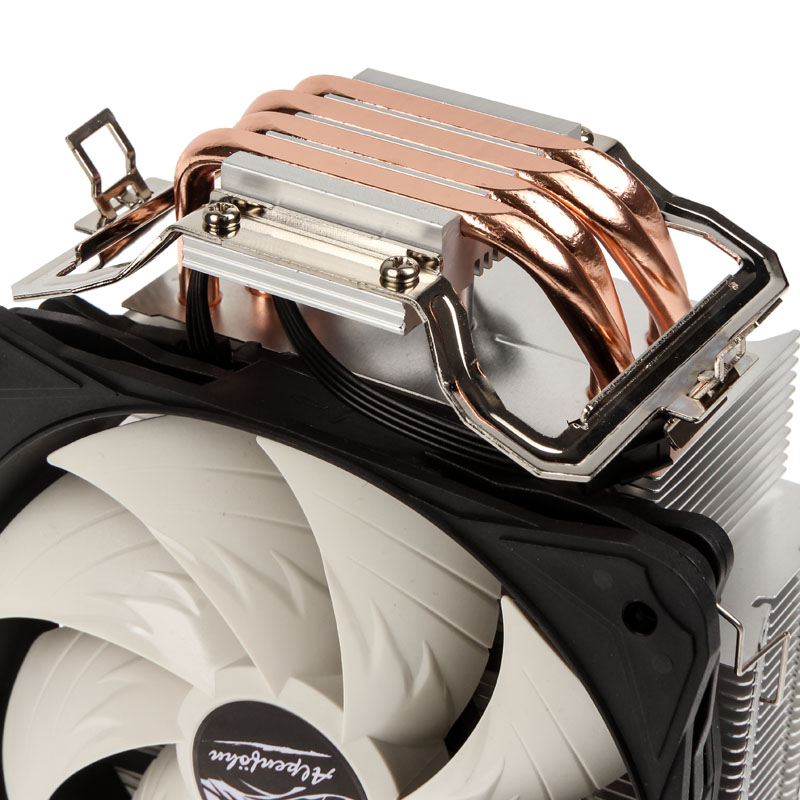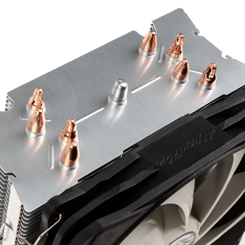 Bei der Advanced Version kommen vier 6 Millimeter-Heatpipes zum Einsatz, die direkt auf dem Heatspreader der CPU aufliegen. Dadurch ist eine zuverlässige und schnelle Übertragung von Abwärme auch mit konventioneller Wärmeleitpaste gewährleistet. Der zentral im Kühler platzierte Schock-Killer-Pole sorgt im etwas größeren Kühlkörper für eine Stabilisierung der Lamellen und beugt somit Schäden durch direkte Krafteinwirkungen und Erschütterungen vor.