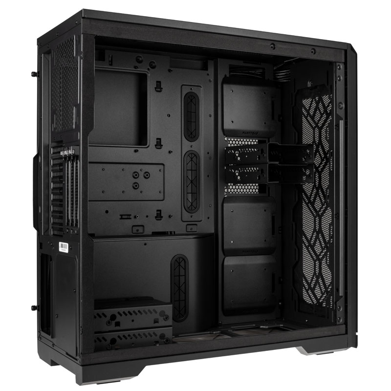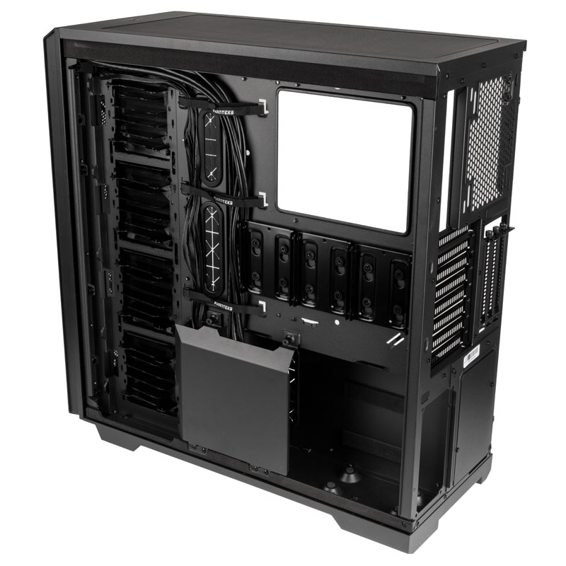 Der Big-Tower bietet einen ausgeklügelten Innenraum mit schwarzer Pulverbeschichtung und zahlreichen Finessen. Im Boden des Gehäuses befindet sich eine (in der Tempered Glass-Version RGB-beleuchtete) Netzteilabdeckung, auf der ein zweites System im Mini-ITX-Format oder ein zweites Netzteil installiert werden kann. Beide Halterungen dafür gehören zum Lieferumfang. Neben den acht PCI-Slotblenden bietet das Gehäuse zweimal je drei vertikale PCI-Slotblenden zur vertikalen Montage von Grafikkarten (Riser-Kabel nicht inklusive). Die Karten dürfen bis zu 503 Millimeter lang sein und können ggf. durch das Temperglas-Seitenteil bewundert werden. Zahlreiche gummierte Kabelschächte, die mitgelieferten Kabelbinder mit Klettverschlüssen und zusätzliche Abdeckungen bieten ausgezeichnete Möglichkeiten für eine saubere, unsichtbare Kabelführung.