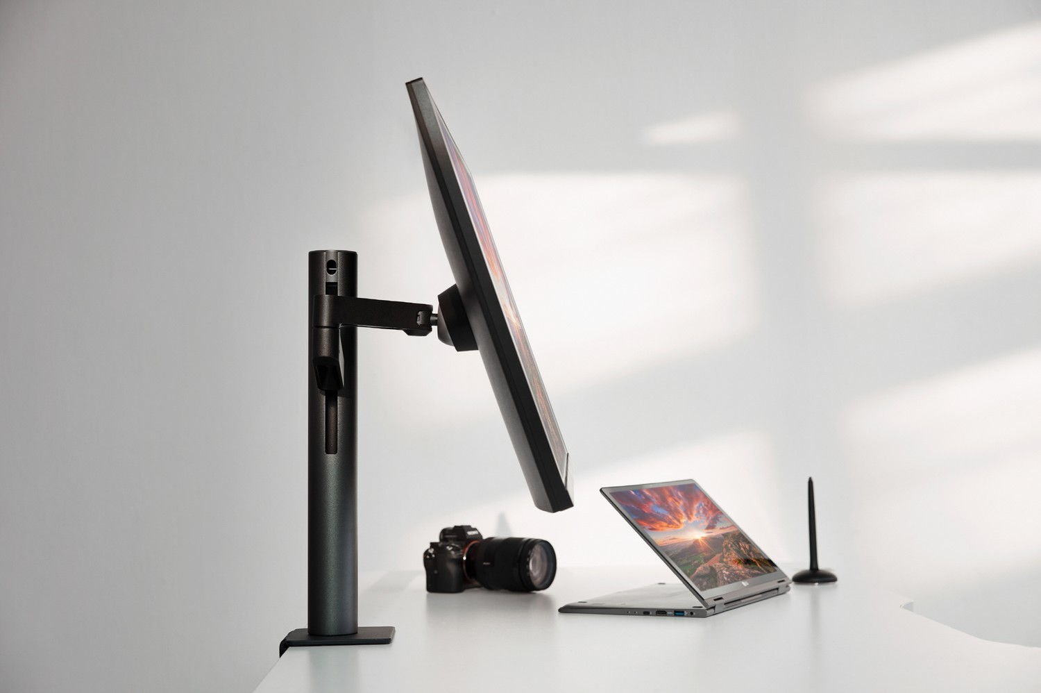 Visuelle Ruhe ist nicht alles: Weil die Monitore präzise ausbalanciert sind, lassen sie sich mit sanften Bewegungen in jede beliebige Position bringen. Nutzer können sie leicht in der Höhe verstellen, aus- und einfahren, neigen, schwenken und zwischen Quer- und Hochformat drehen.