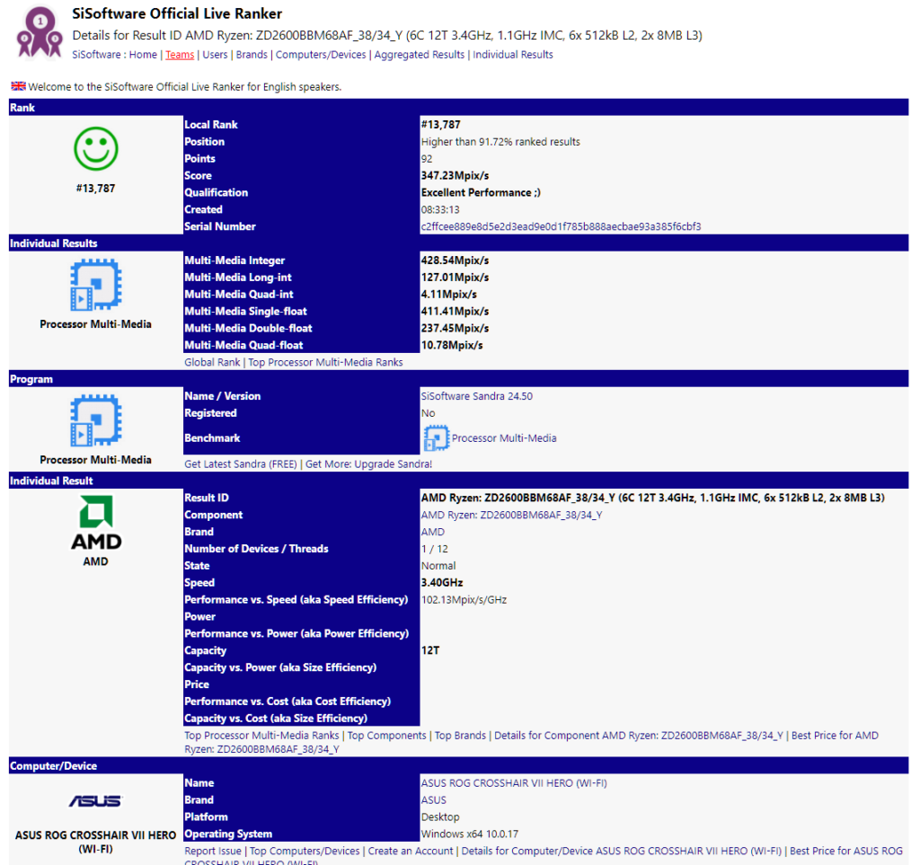 Entsprechend der Auflistung wurde der Chip in ein ASUS Crosshair VII Hero Mainboard auf Basis des X470 Chipsatzes von AMD eingebaut. AMD hat noch keine Details über X470 geliefert, obwohl das Unternehmen gesagt hat, dass es für Ryzen-Prozessoren der zweiten Generation optimiert ist und dass es niedrigere Leistungsmerkmale und eine etwas bessere Leistung bieten wird.