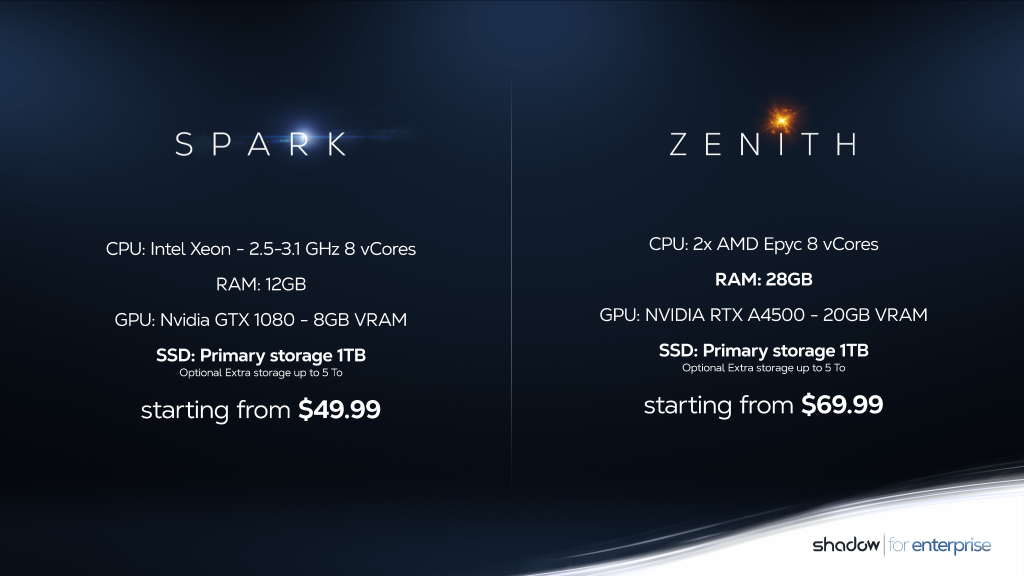 Die Shadow for Enterprise-Angebote profitieren sowohl von besseren technischen Merkmalen – jetzt 1 TB SSD-Speicher, und Zenith for Enterprise jetzt mit bis zu 28 GB RAM – als auch von einer allgemeinen Preissenkung. Weitere Details unten: