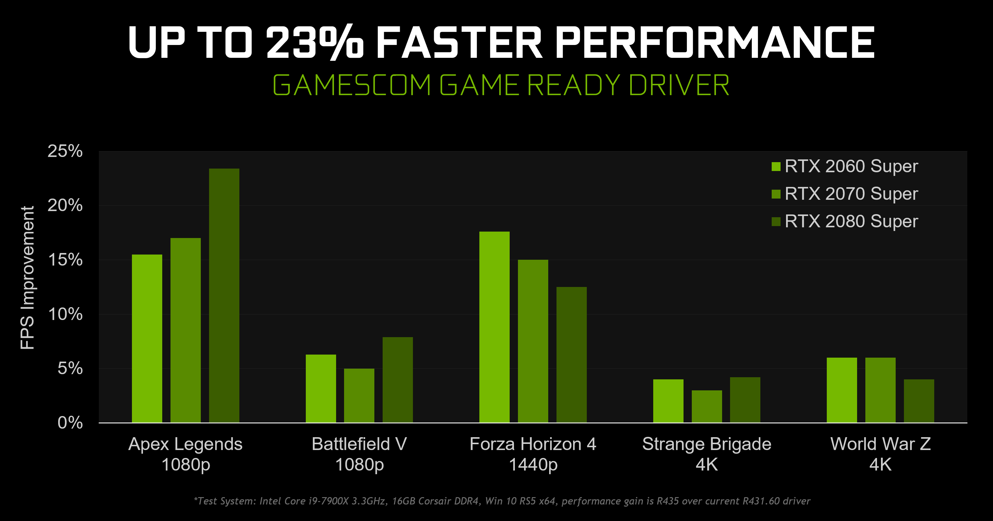 NVIDIA veröffentlicht einen speziellen gamescom Game-Ready-Treiber, der Optimierungen für Apex Legends, Battlefield V, Forza Horizon 4, Strange Brigade und World War Z mit sich bringt, welche die Framerates um bis zu 23 Prozent erhöhen.