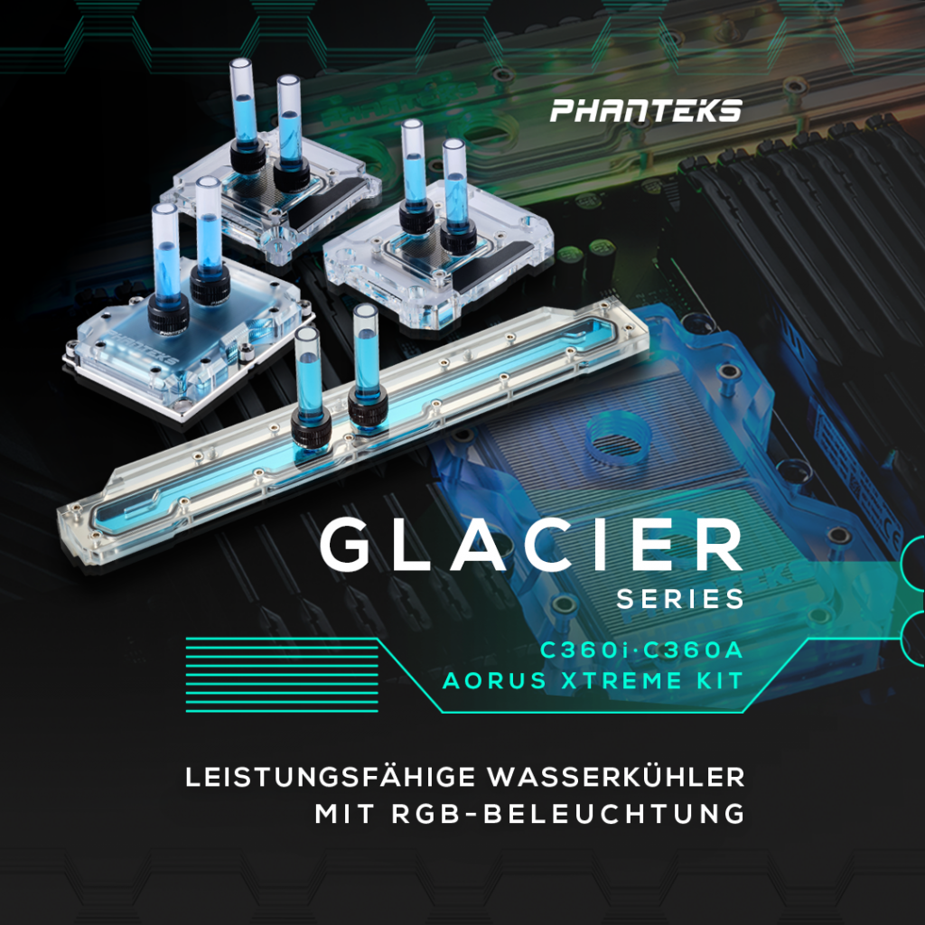 Berlin, 28.08.2019 – PHANTEKS freut sich die Erweiterung seines Wasserkühlungssortiments um drei neue Glacier-Produkte bekanntzugeben. Die Gigabyte C621 Aorus Xtreme Kit sowie C360i und C360a Wasserblöcke sind wie alle Produkte der Glacier-Serie aus hochwertigen Materialien hergestellt und haben eine hohen Qualitätsstandard, der maximale Kühlleistung garantiert. Vernickeltes Kupfer sorgt in Verbindung mit einem Acryldeckel nicht nur für eine grandiose Abführung der Abwärme, sondern durch die integrierten digital adressierbaren RGB-LEDs auch für eine atemberaubende Optik. Jetzt bei Caseking.