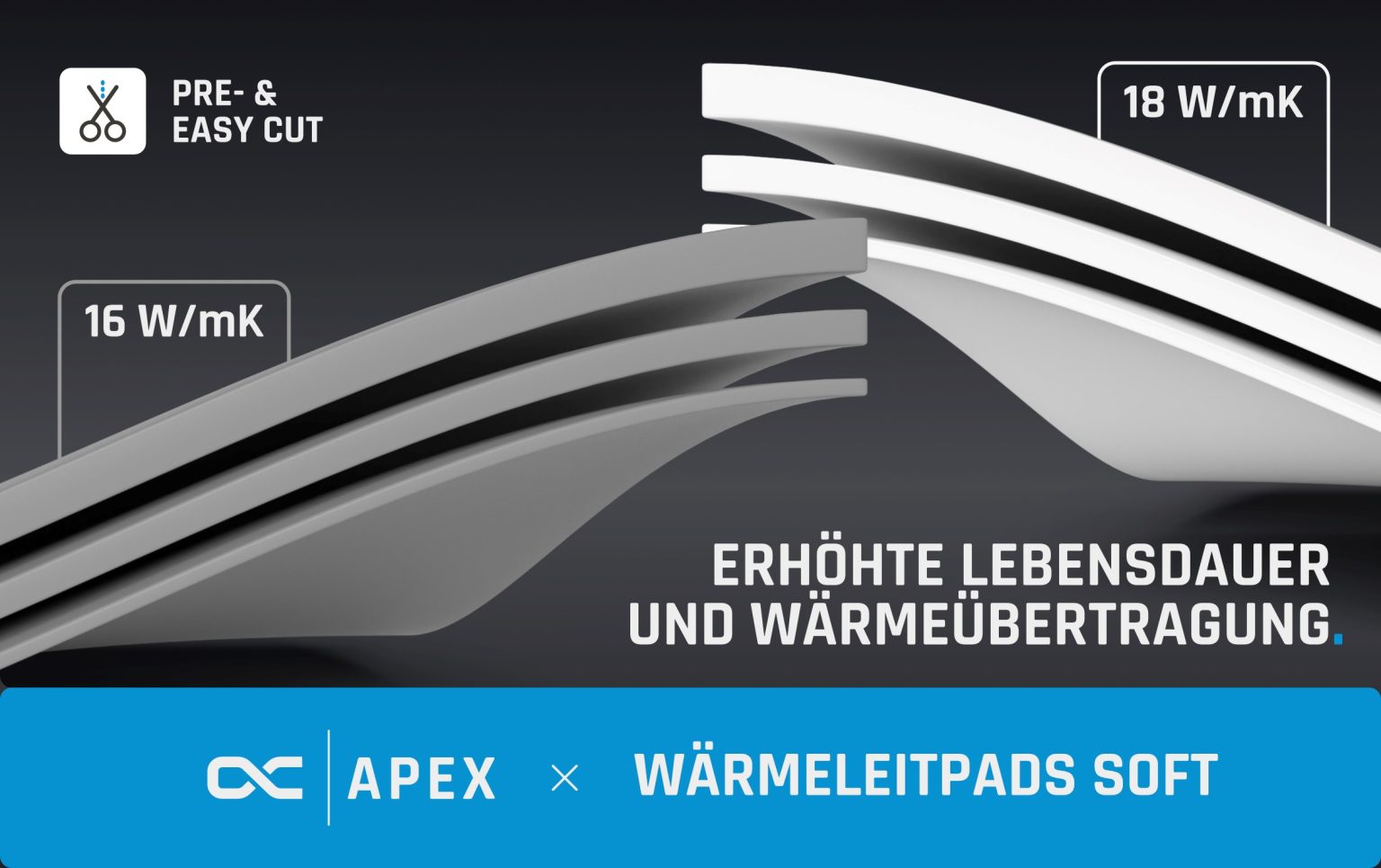 Die Apex Wärmeleitpads Soft sind in zwei Leistungsstufen, 16 W/mK und 18 W/mK, und drei Dicken, 0,5mm, 1mm und 1,5mm, erhältlich.