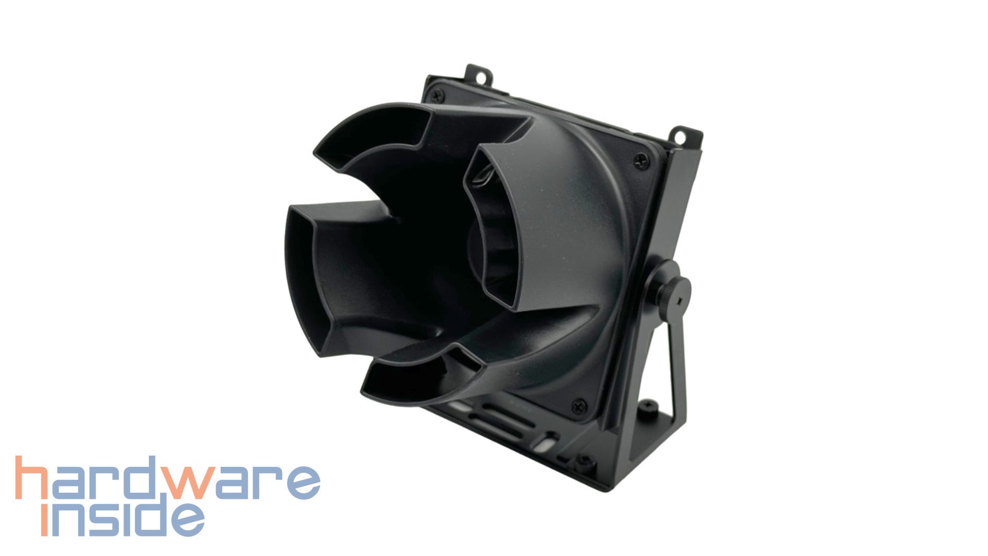 Das Herzstück des Noctua NV-FS1 ist bereits vormontiert. Im Grunde besteht das Konstrukt aus der NV-FM1 Mehrzweck-Lüfterhalterung, in welcher der NF-A12x25 PWM chromax.black Lüfter mittels einer dreiteiligen Verschraubung montiert ist. Auf der Vorderseite sehen wir den ungewöhnlichen NV-AA1-12 Luftstromverstärker, welcher den Luftstrom bündeln soll, um die Reichweite zu erhöhen. Die Halterung selbst besteht aus schwarz lackiertem Stahl und der Luftstromverstärker aus schwarzem Kunststoff.