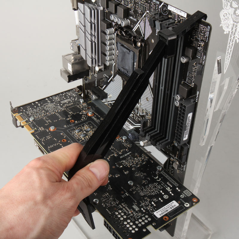 Verwendung von platzraubenden Wasserkühlungen oder übergroßen RAM-Bausteinen findet sich ein Platz für den Grafikkarten-Halter.