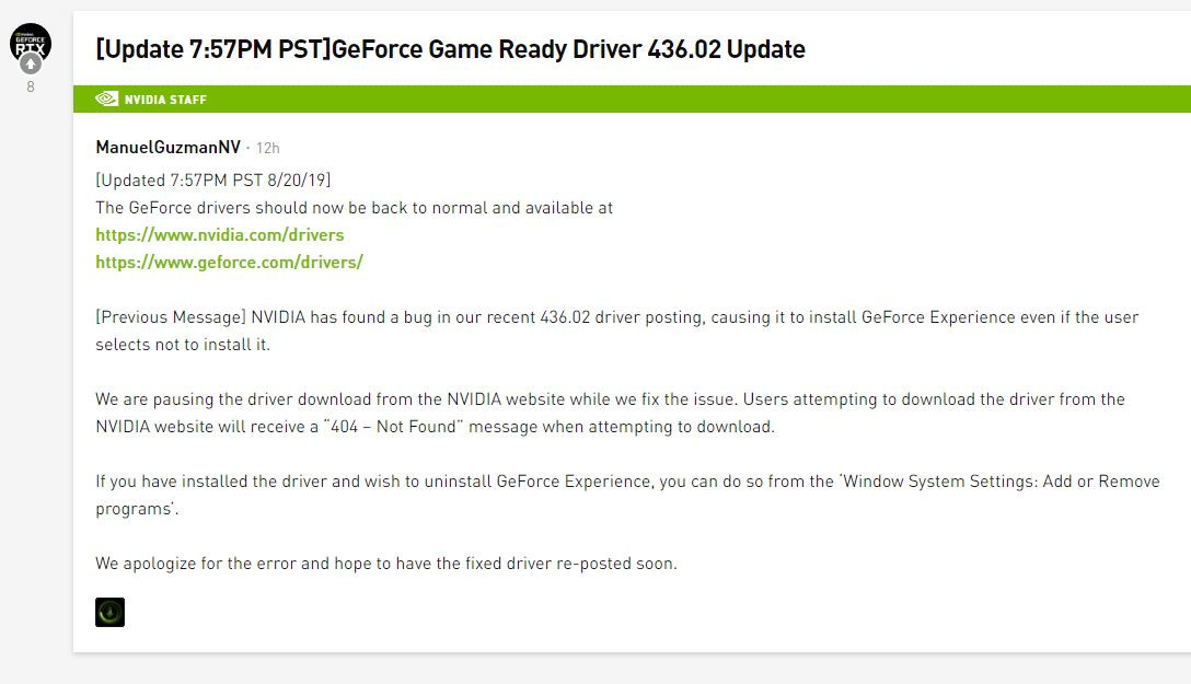 Später am Abend holte NVIDIA den Treiber vorübergehend aus dem Download-Bereich seiner Website und lud die Treiber Stunden später mit einem Installer neu hoch, der diesen Fehler behebt. Die Versionsnummer des Treibers bleibt gleich, lediglich ein „-rp“-Suffix im Dateinamen der Installationsbinärdatei wird geändert (z.B.: „436.02-desktop-win10-64bit-international-whql-rp.exe“).