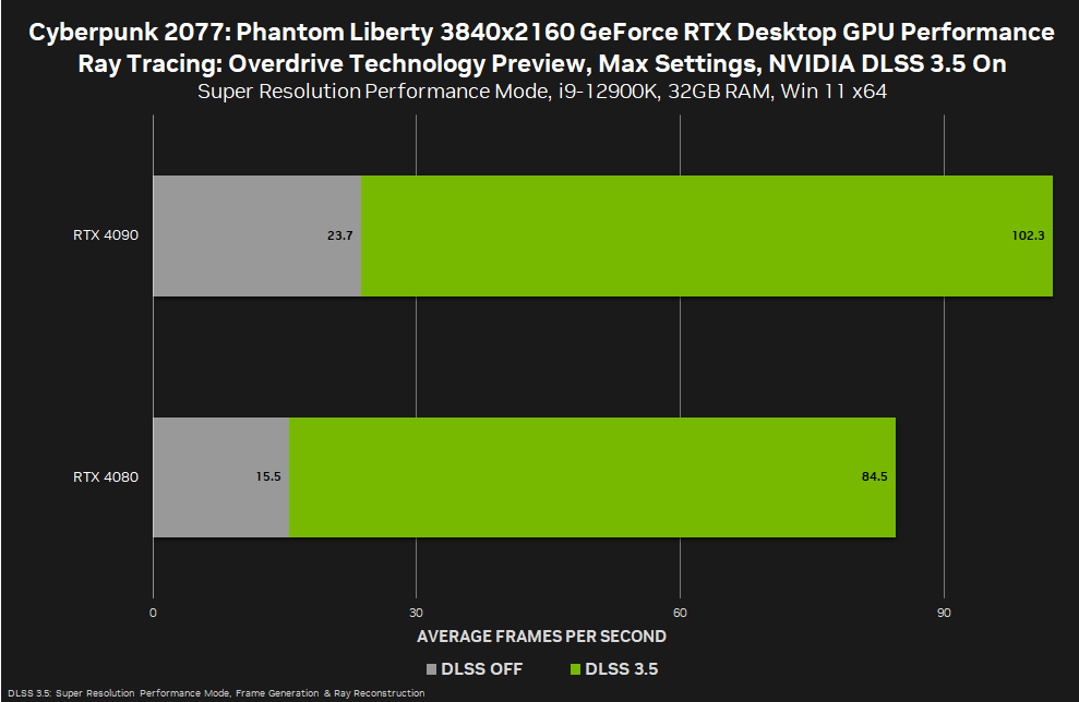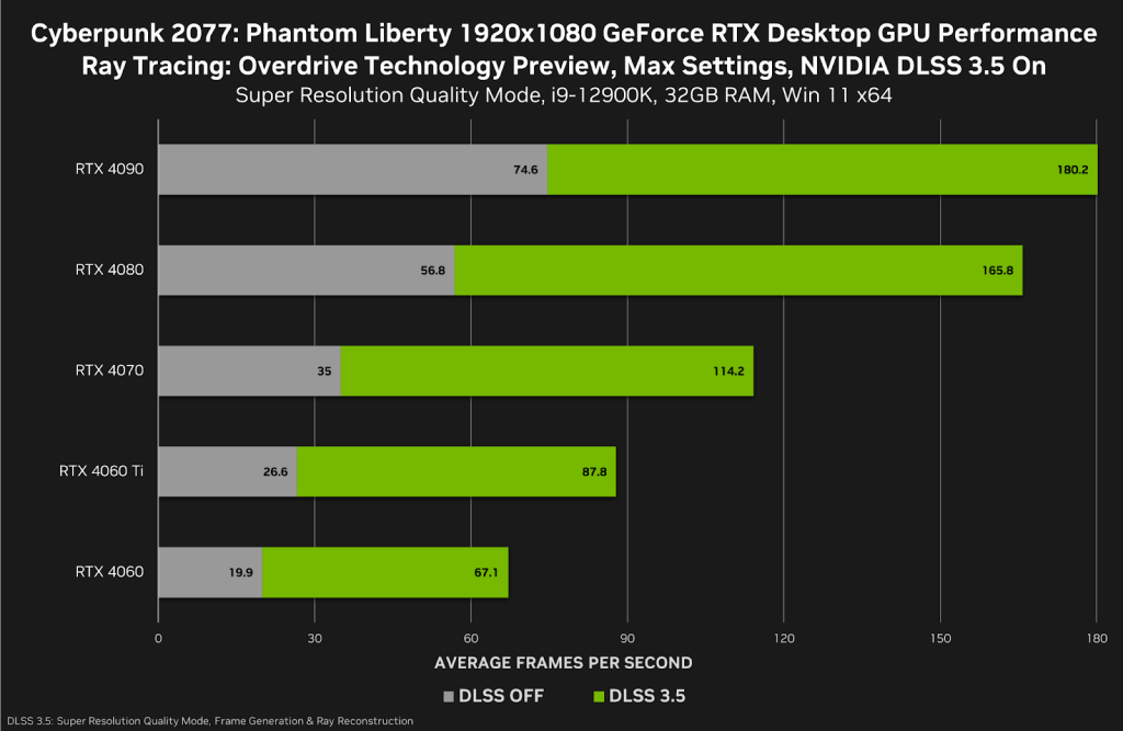 Bei 1920×1080 können alle Spieler der GeForce-RTX-40er-Serie Cyberpunk 2077: Phantom Liberty in höchster Detailtreue erleben, dank einer durchschnittlichen Leistungssteigerung um das Dreifache dank Frame Generation, Super Resolution und Ray Reconstruction:
