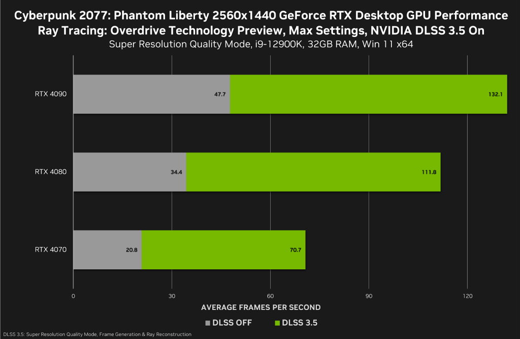 Bei 2560×1440 vervielfacht DLSS 3.5 die Leistung im Durchschnitt um das Dreifache und ermöglicht 60 FPS+ Gameplay auf der GeForce RTX 4070 und höher: