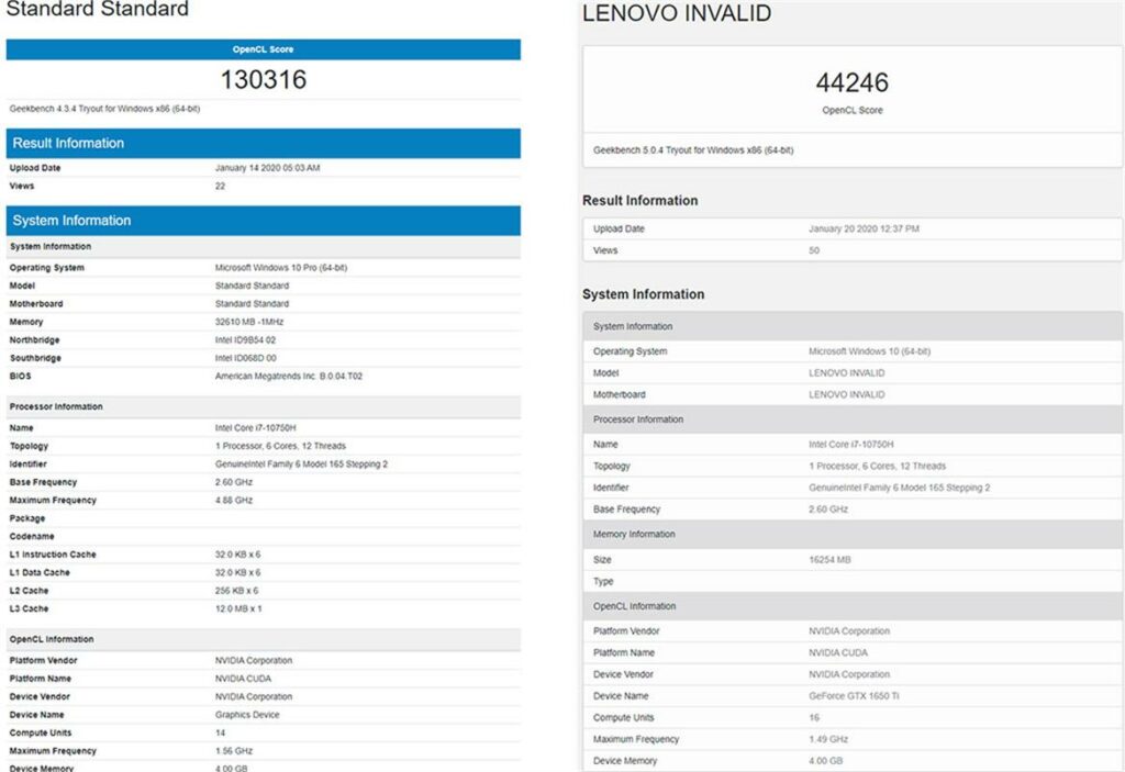 Die GeForce GTX 1650 Ti wird auf der linken Seite und die GeForce GTX 1650 Super auf der rechten Seite angezeigt. Zu beachten gilt jedoch die Software-Version der jeweiligen Benchmark-Durchgänge. Die erste wurde auf der Geekbench 4.3.4 und die zweite auf der Geekbench 5.0.4 Version ausgeführt.