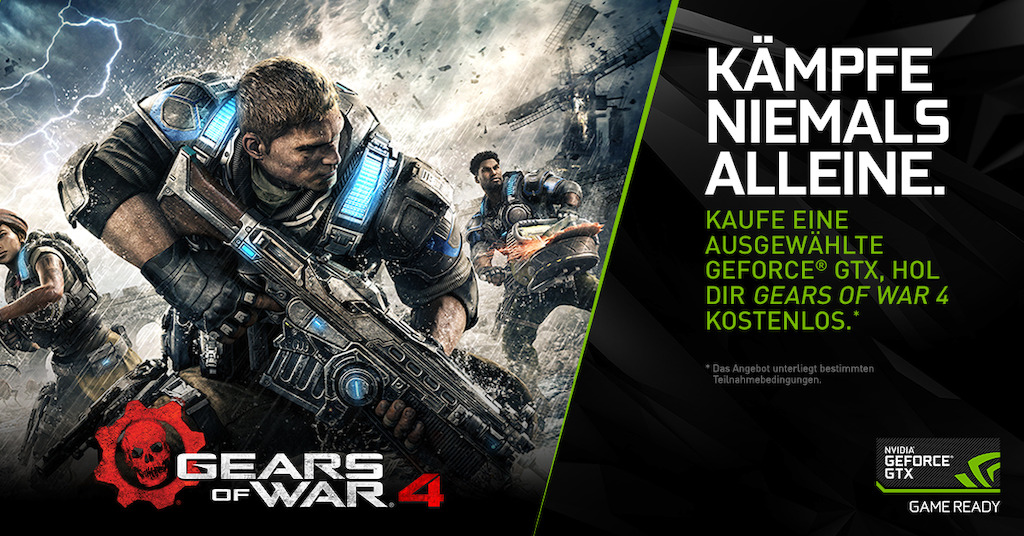 Wer das mit Spannung erwartete Gears of War 4 flüssig in 4K-Auflösung zocken will, macht dies am besten mit einem PC inklusive NVIDIA-Pascal-Grafikkarte. Beim Kauf einer GeForce-GTX-1080- oder GTX-1070-GPU oder ausgewählter GeForce-GTX-PCs und -Notebooks legt NVIDIA ab sofort den Blockbuster Gears of War 4 kostenlos bei. Und das Beste: da es sich um einen Xbox-Play-Anywhere-Titel handelt, ist der Bundle-Code erstmalig ebenfalls für die Xbox One gültig! Ein perfekter Deal für alle Konsolenspieler, die ihren PC aufrüsten wollen.