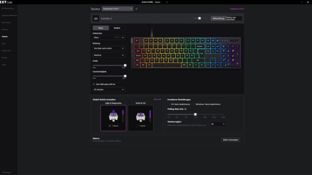 Wer wirklich alle Funktionen der NZXT FUNCTION 2 nutzen möchte, der benötigt die Software namens CAM von der Seite des Herstellers. Über diese Software lassen sich nahezu alle Geräte des Herstellers steuern. Dabei ist sie übersichtlich aufgebaut und einfach zu bedienen. Es lassen sich vordefinierte Beleuchtungsprofile aktivieren, darunter der klassische Farbverlauf und atmende Effekte. Zusätzlich lässt sich jede Taste einzeln anders beleuchten, was schöne Effekte ermöglicht. Ganz besonders hat uns gefallen, dass die Tastatur in einzelne Bereiche unterteilt werden kann und dann verschiedene Beleuchtungsprofile zugewiesen werden können. Neben den diversen Beleuchtungseinstellungen können wir natürlich auch den Tasten weitere oder andere Funktionen sowie selbst erstellte Makros zuordnen.