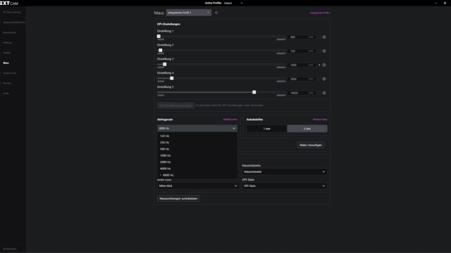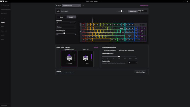 In der Software lässt sich zudem die Abfragerate (Pollingrate) in einem Bereich von 125 bis 8.000 Hz einstellen. Auch die bereits erwähnte Änderung des Auslösewegs lässt sich hier erledigen, dabei stehen 1,0 mm oder 1,5 mm zur Auswahl.