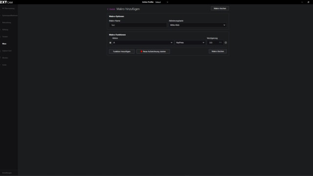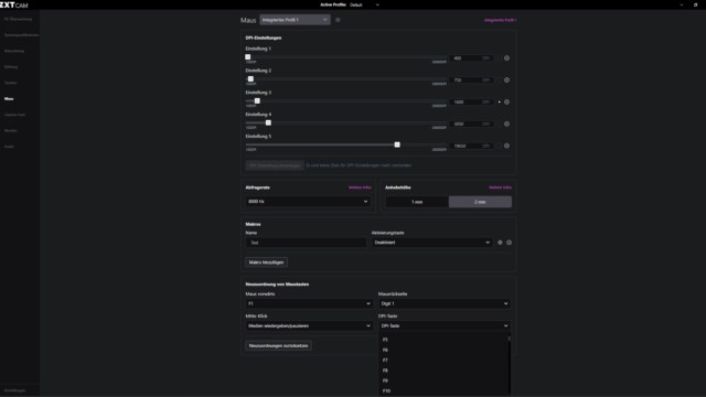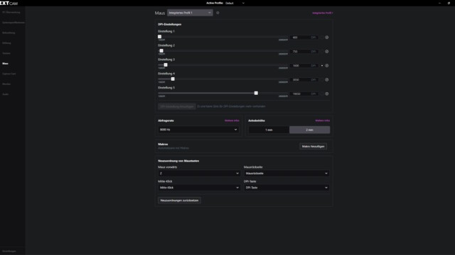 In CAM lassen sich auch diverse Einstellungen der NZXT LIFT 2 SYMM erledigen. So können hier bis zu fünf DPI-Stufen eingerichtet werden, dabei kann die Auflösung über einen Schieberegler zwischen 100 bis 26.000 DPI eingestellt werden. Die Stufen lassen sich dann später über die Taste hinter dem Mausrad durchschalten. Damit der Nutzer auch weiß, welche Stufe gewählt ist, wird dies auf Wunsch kurz eingeblendet. Natürlich kann auch hier die Abfragerate wie bei der Tastatur gewählt werden. Zudem lassen sich die Tasten mit Funktionen belegen und Makros lassen sich ebenfalls anfertigen. Über eine Beleuchtung verfügt die Maus nicht.