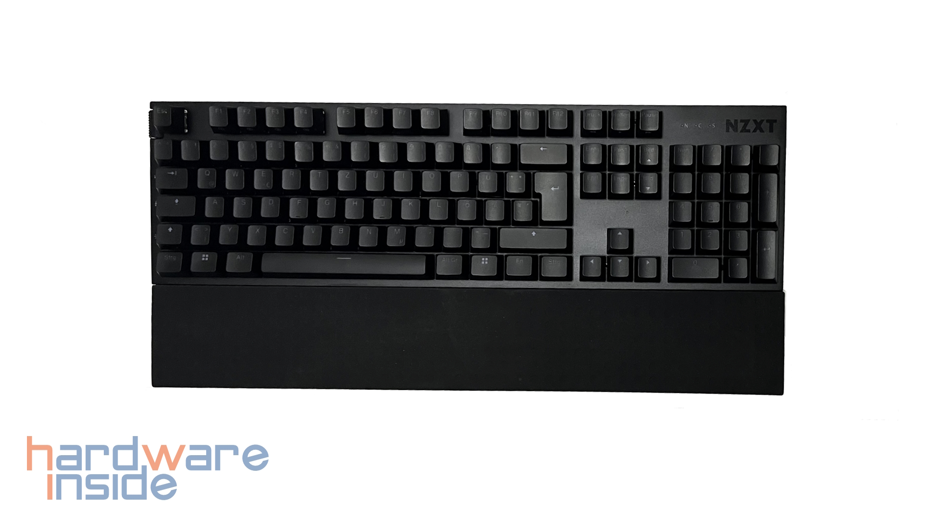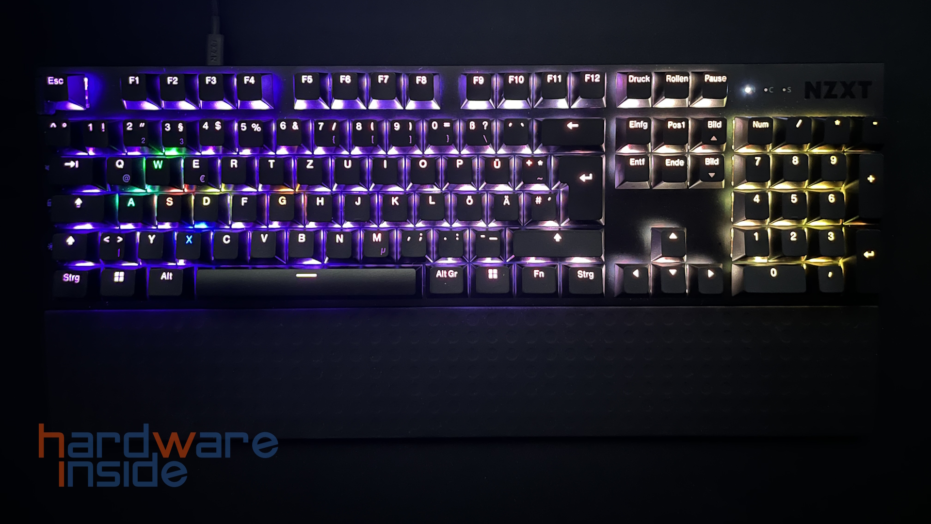Bei den Tastenkappen setzt NZXT bei dieser Tastatur auf Double-Shot-PBT-Tastenkappen. Diese sind erfahrungsgemäß haltbarer als Kappen aus ABS-Kunststoff und neigen auch nicht so schnell zum Glänzen. Ein Nachteil ist, dass die Beschriftung und Ausleuchtung etwas dunkler sind.