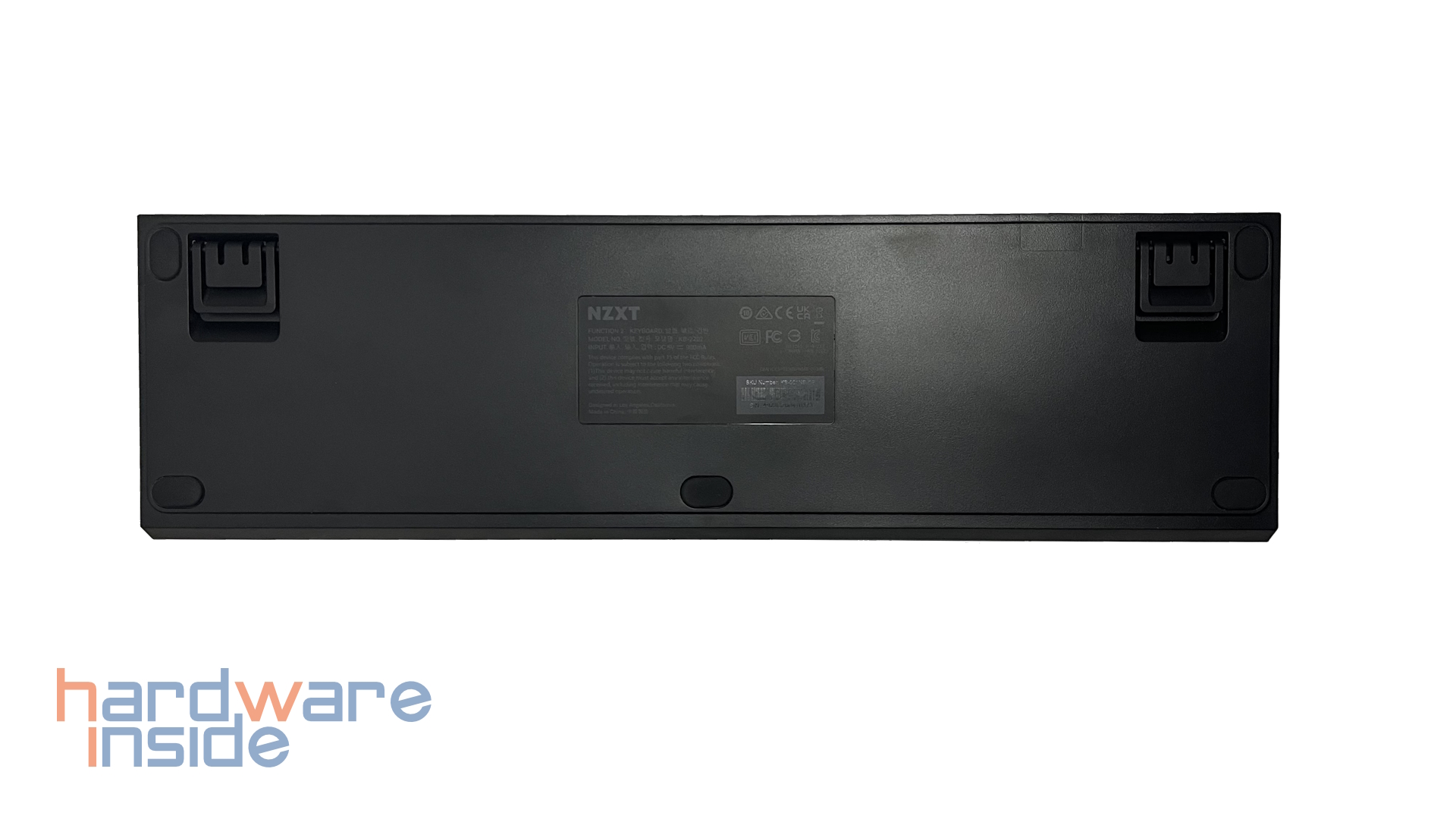 An der Unterseite steht die Tastatur rutschsicher auf insgesamt fünf großen Füßen aus Gummi. In der Mitte ist ein Aufkleber mit einigen der technischen Daten angebracht. Das Gehäuse der Tastatur besteht, bis auf die Abdeckung auf der Oberseite, komplett aus schwarzem Kunststoff. Im hinteren Bereich befinden sich noch zwei Beine, welche sich zweifach verstellen lassen.
