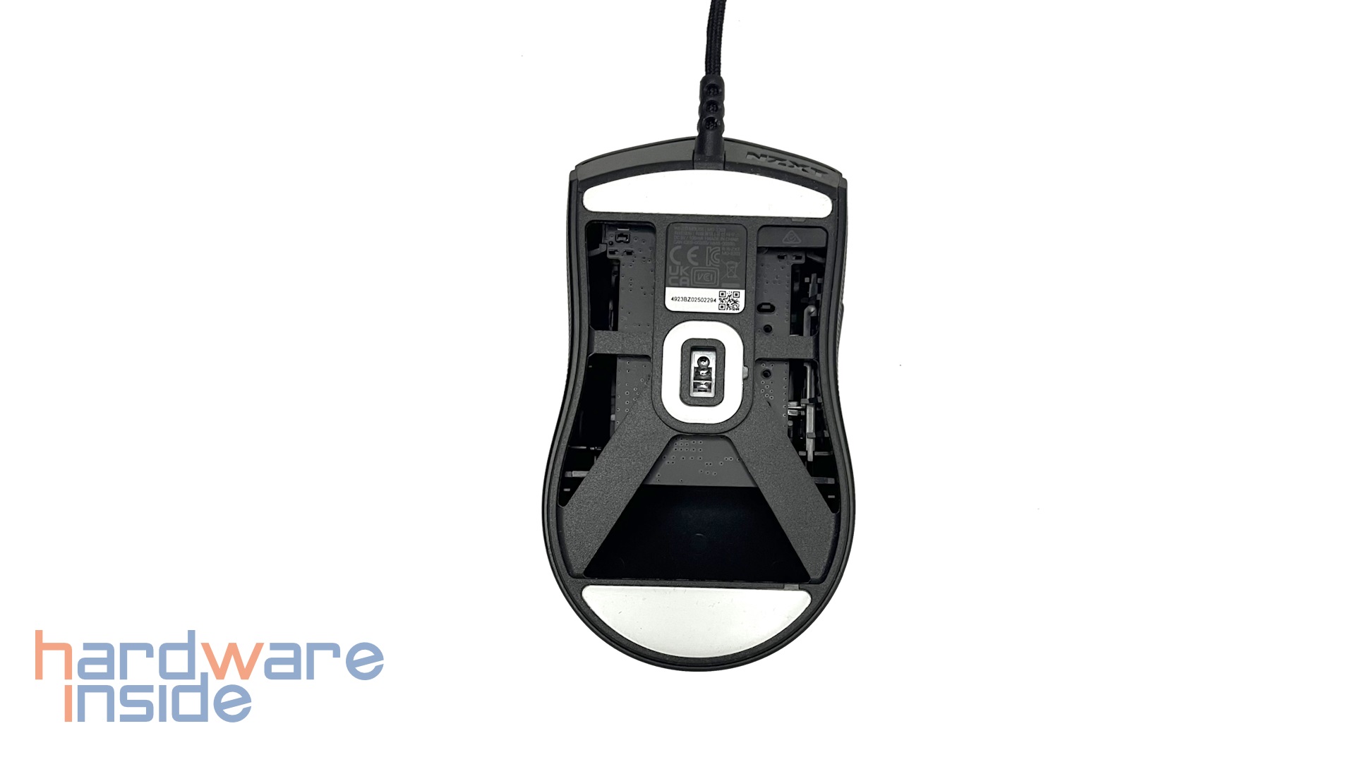 Die Unterseite der NZXT LIFT 2 SYMM ist interessant gestaltet. Hier hat man große Flächen der Unterseite weggelassen, was zur Gewichtsreduktion beiträgt. Vorne sowie auch hinten verfügt die Unterseite über zwei große Gleitflächen aus PTFE. Mittig ist der PixArt PMW3395 Sensor verbaut. Dabei handelt es sich um einen optischen Sensor, den wir bereits von der ein oder anderen Maus kennen. Der Sensor löst mit bis zu 26.000 DPI auf und verfügt über eine Abfragerate von 8.000 Hz.