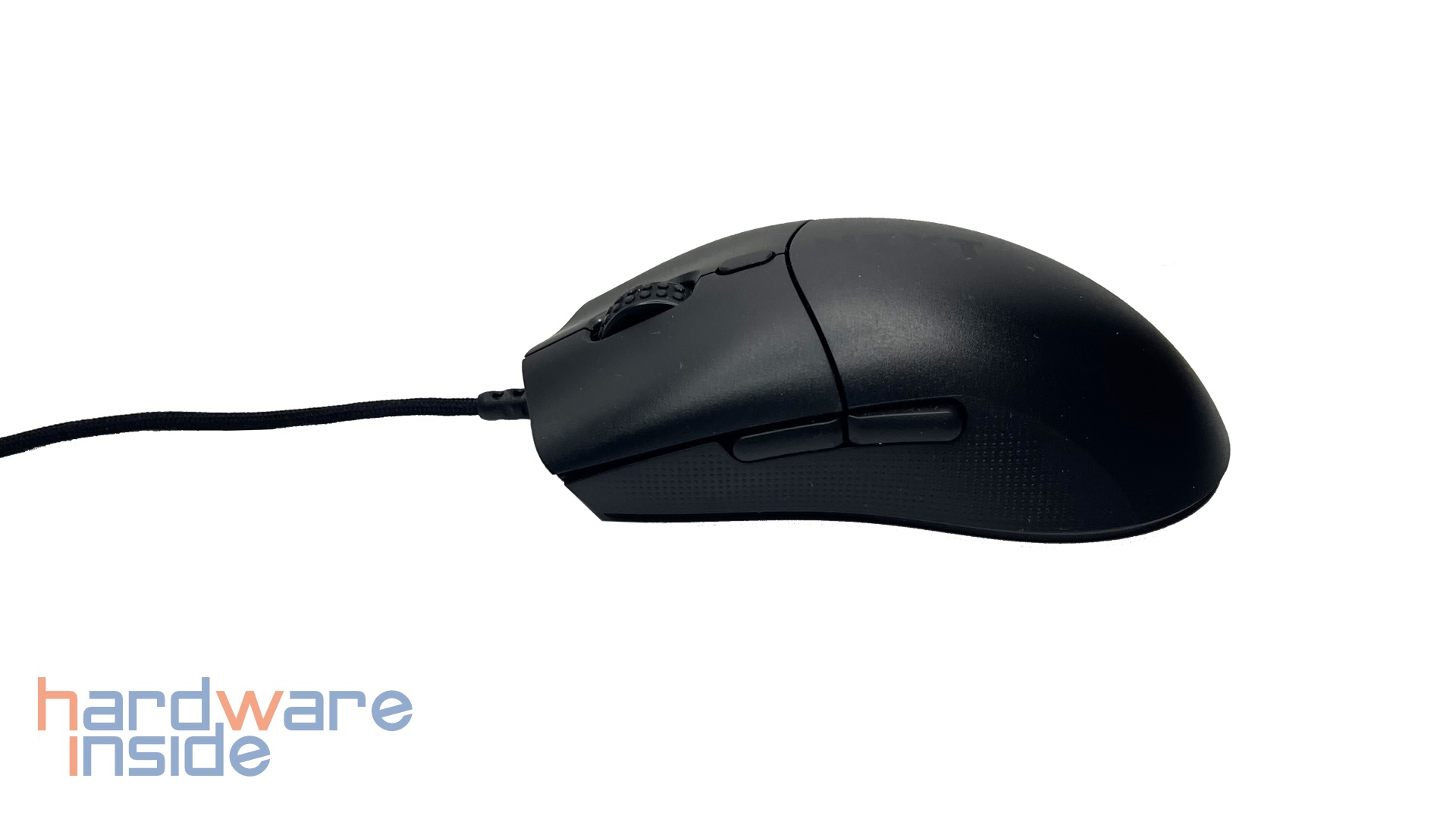 An der rechten Seite finden wir ebenfalls eine gröber strukturierte Oberfläche, hier allerdings ohne weitere Tasten. Aus der Ansicht von hinten ist zu sehen, dass die Maus symmetrisch gestaltet ist, daher eignet sie sich sowohl für Links- als auch für Rechtshänder. Allerdings müssen Linkshänder auf die Daumentasten verzichten.