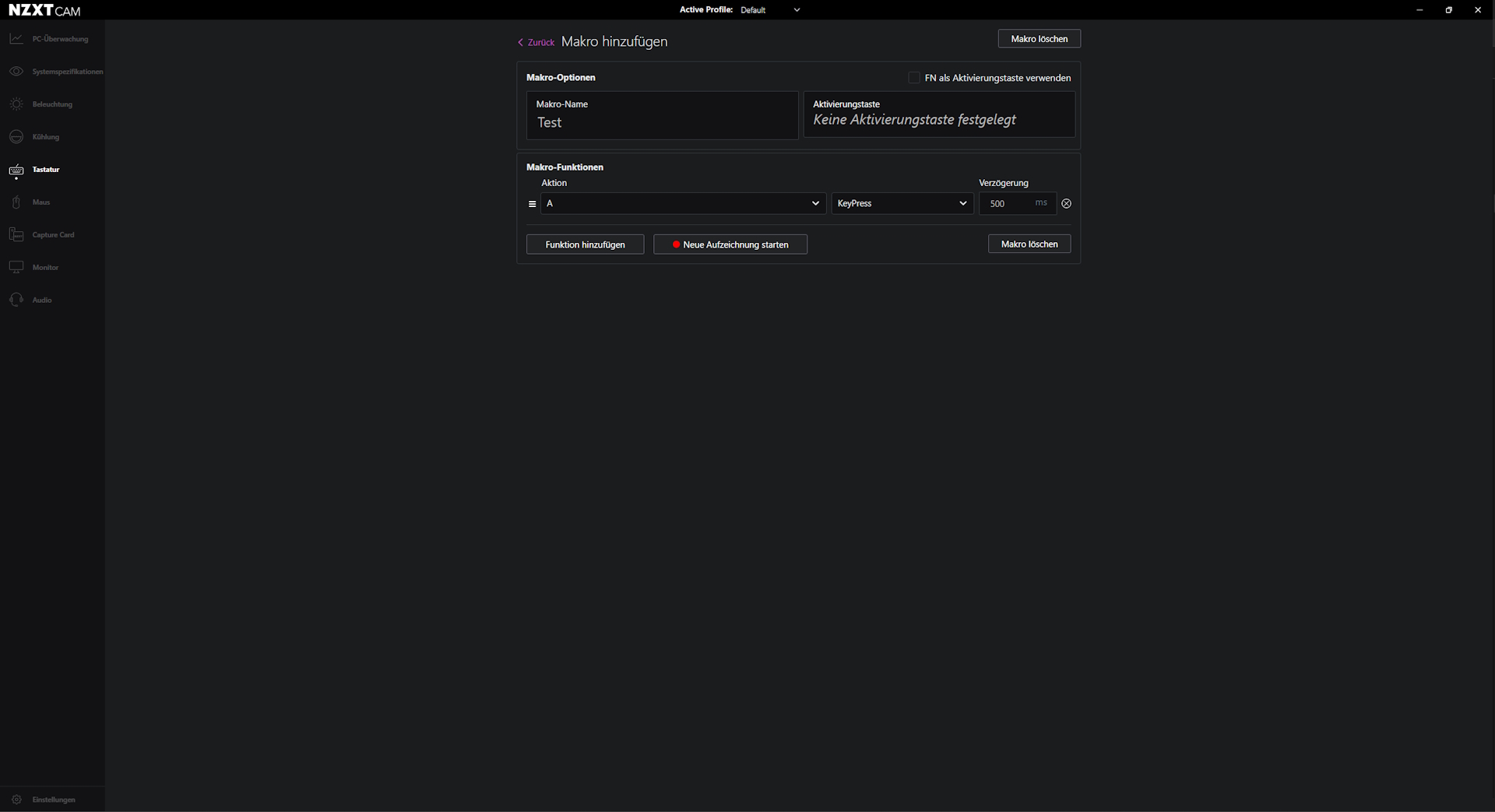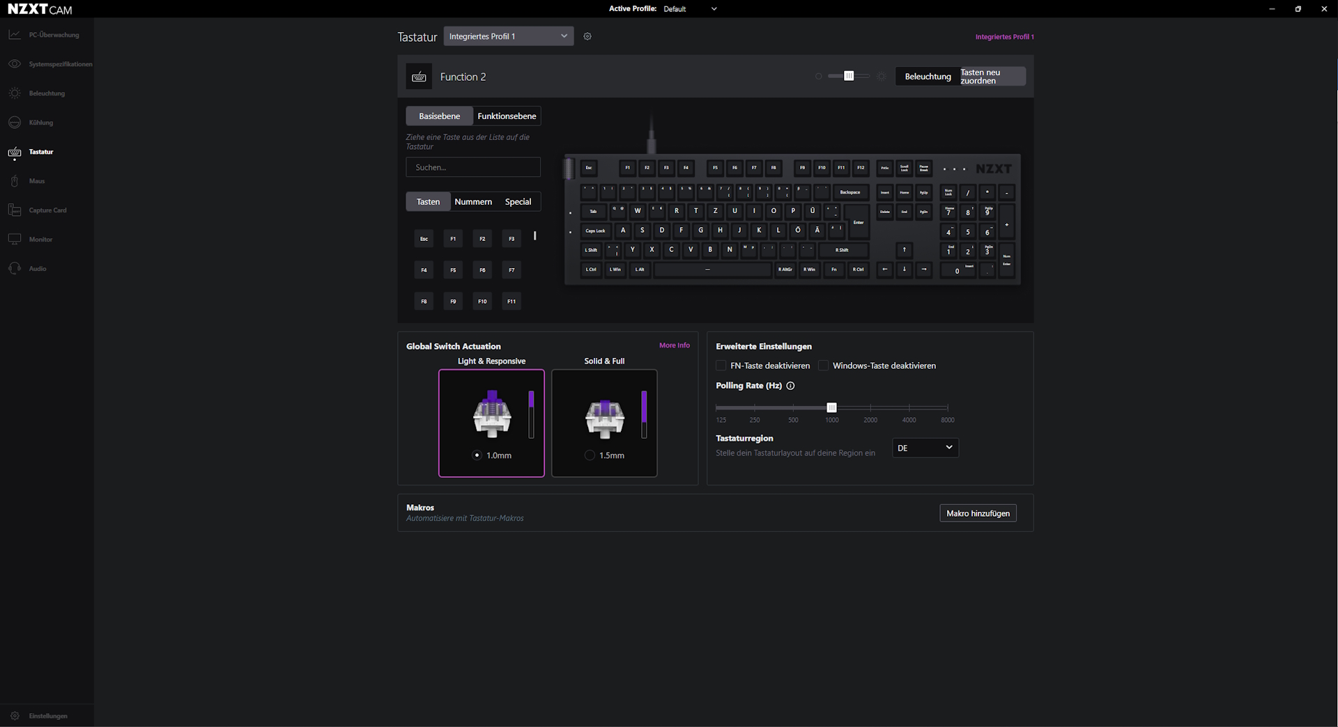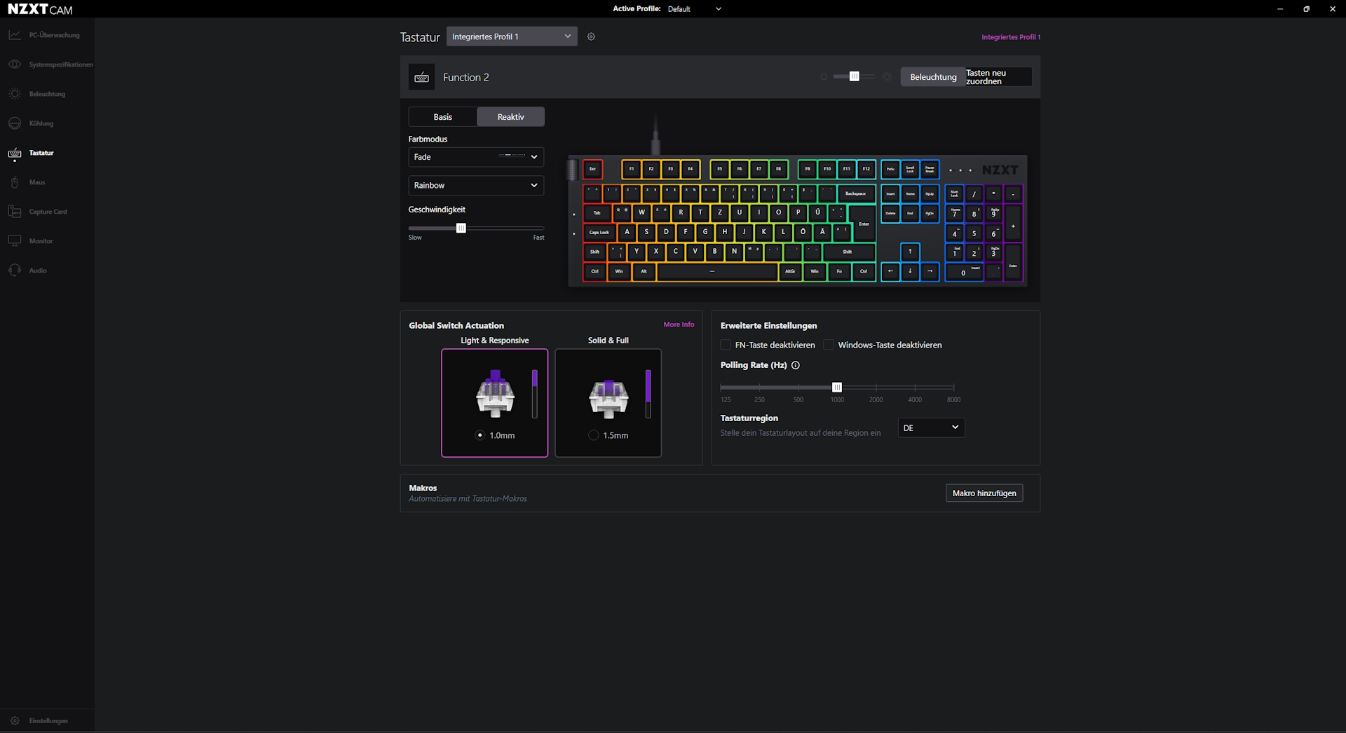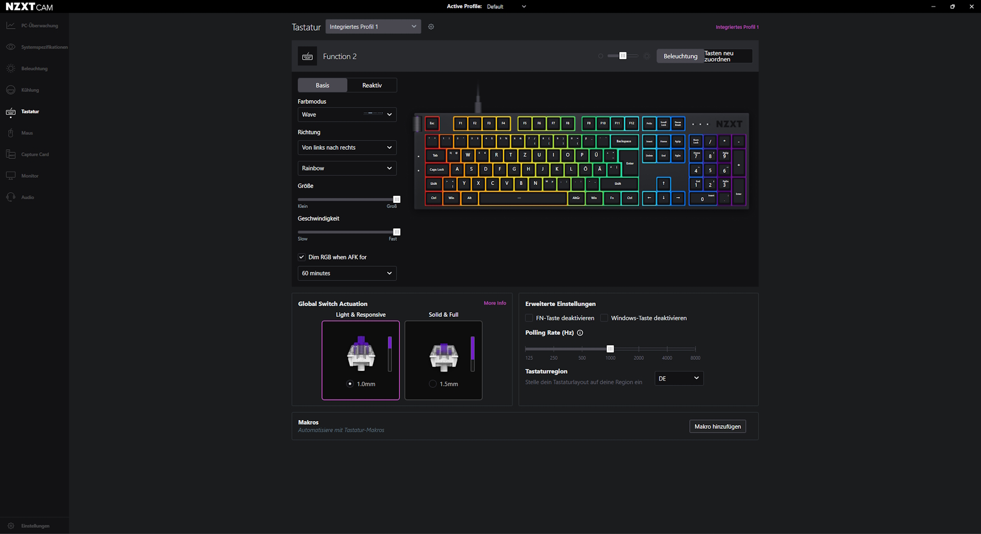 Wer wirklich alle Funktionen der NZXT FUNCTION 2 nutzen möchte, der benötigt die Software namens CAM von der Seite des Herstellers. Über diese Software lassen sich nahezu alle Geräte des Herstellers steuern. Dabei ist sie übersichtlich aufgebaut und einfach zu bedienen. Es lassen sich vordefinierte Beleuchtungsprofile aktivieren, darunter der klassische Farbverlauf und atmende Effekte. Zusätzlich lässt sich jede Taste einzeln anders beleuchten, was schöne Effekte ermöglicht. Ganz besonders hat uns gefallen, dass die Tastatur in einzelne Bereiche unterteilt werden kann und dann verschiedene Beleuchtungsprofile zugewiesen werden können. Neben den diversen Beleuchtungseinstellungen können wir natürlich auch den Tasten weitere oder andere Funktionen sowie selbst erstellte Makros zuordnen.