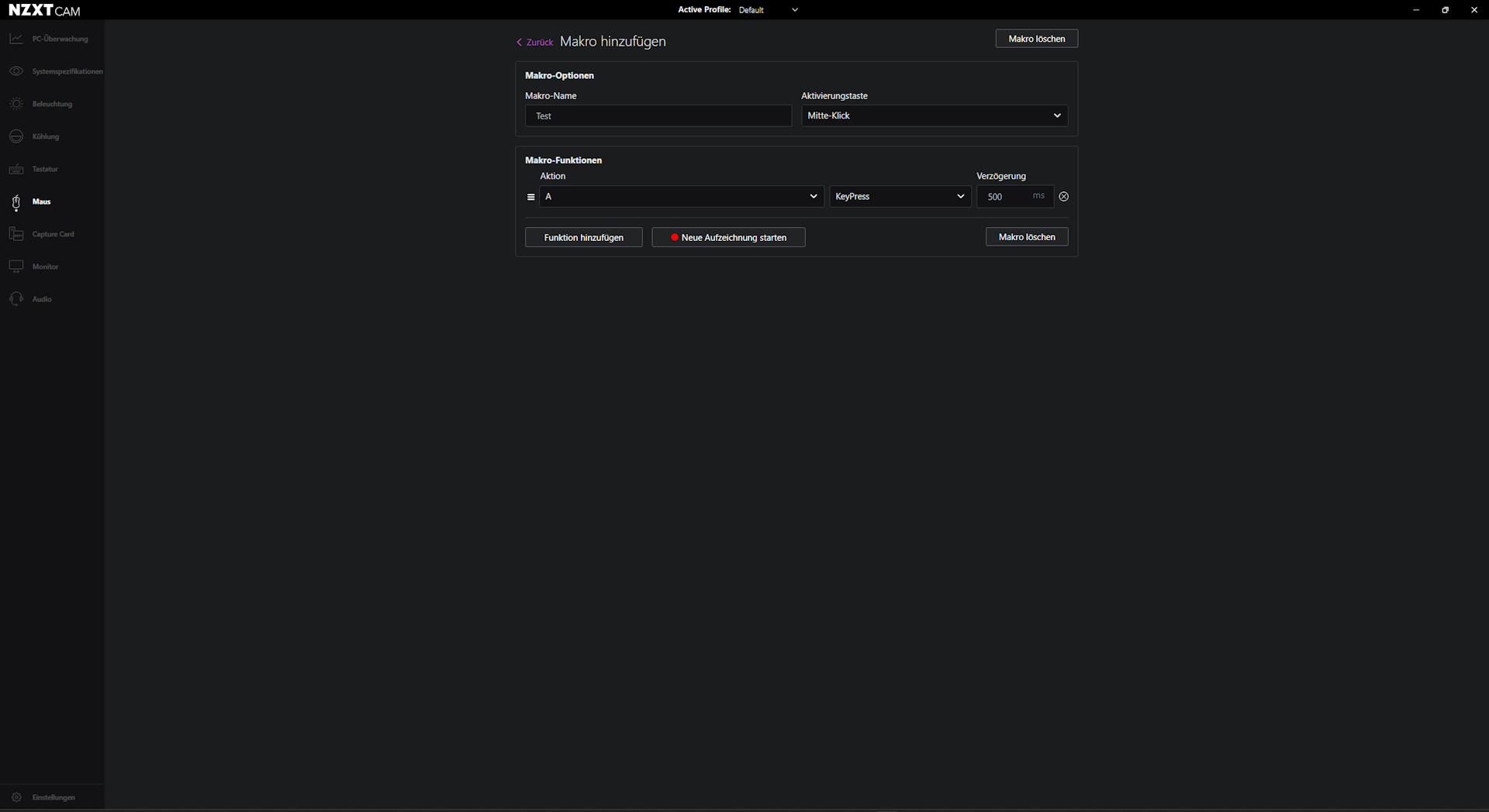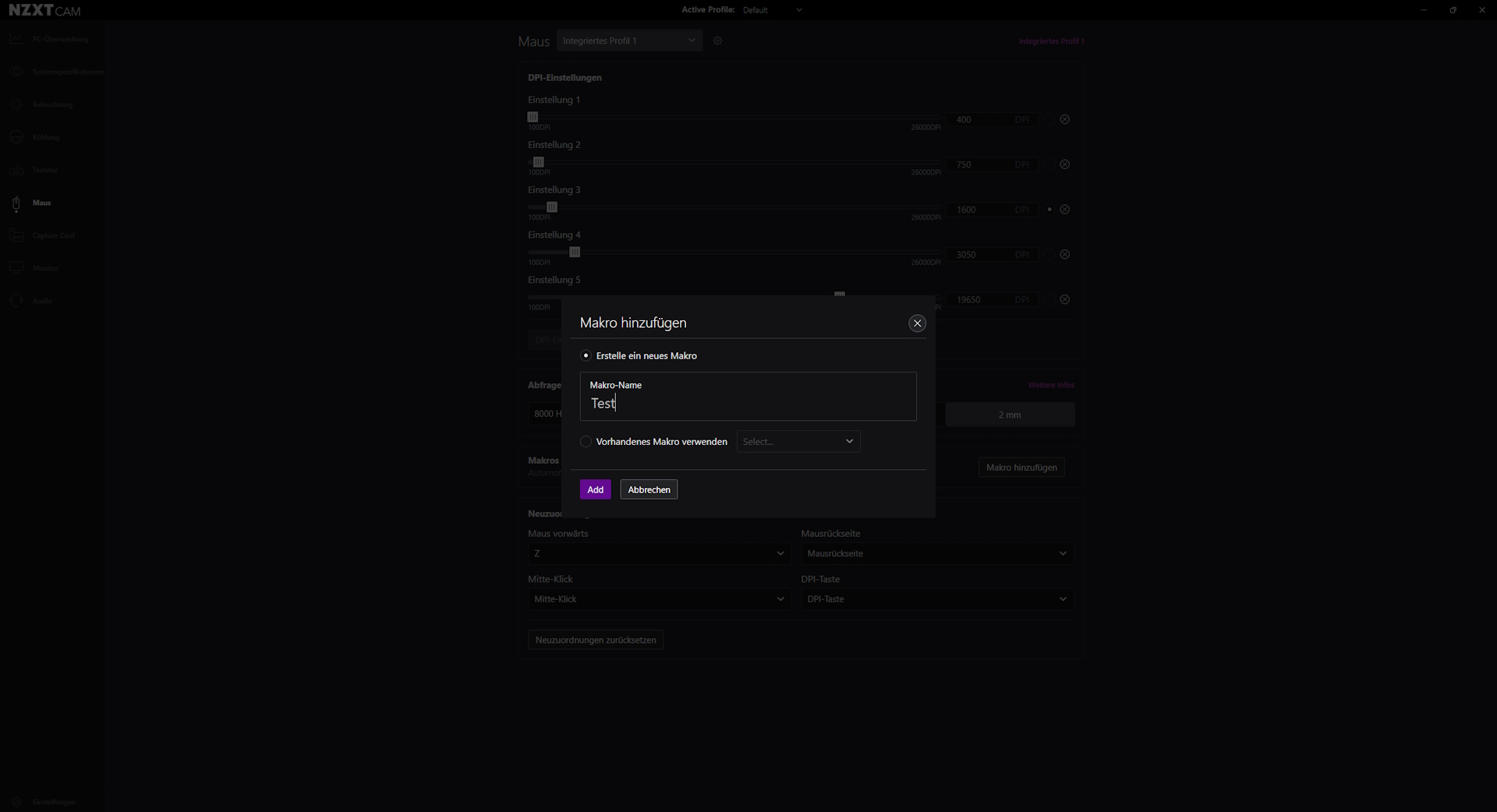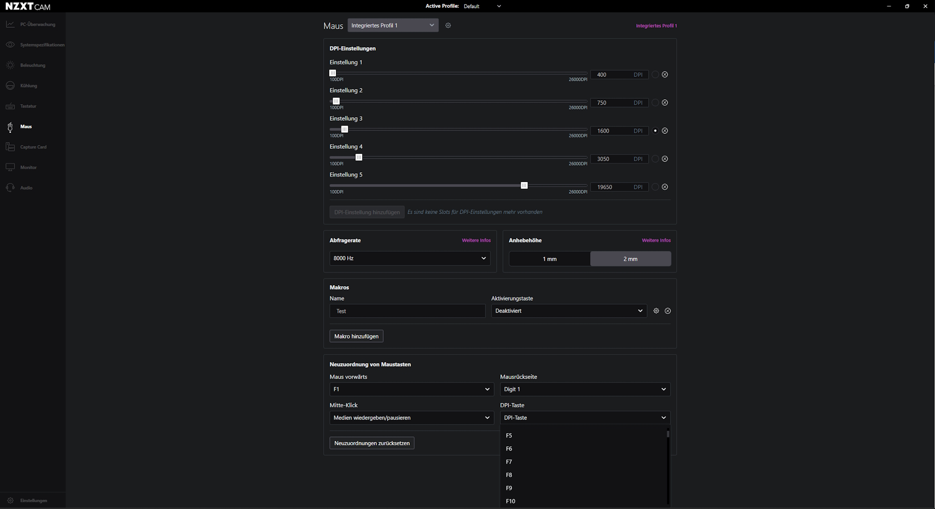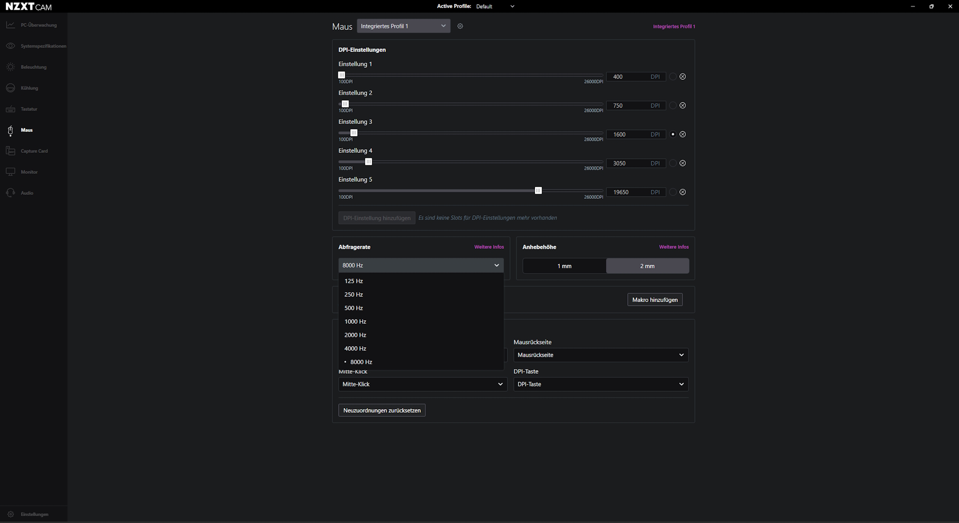 In CAM lassen sich auch diverse Einstellungen der NZXT LIFT 2 SYMM erledigen. So können hier bis zu fünf DPI-Stufen eingerichtet werden, dabei kann die Auflösung über einen Schieberegler zwischen 100 bis 26.000 DPI eingestellt werden. Die Stufen lassen sich dann später über die Taste hinter dem Mausrad durchschalten. Damit der Nutzer auch weiß, welche Stufe gewählt ist, wird dies auf Wunsch kurz eingeblendet. Natürlich kann auch hier die Abfragerate wie bei der Tastatur gewählt werden. Zudem lassen sich die Tasten mit Funktionen belegen und Makros lassen sich ebenfalls anfertigen. Über eine Beleuchtung verfügt die Maus nicht.
