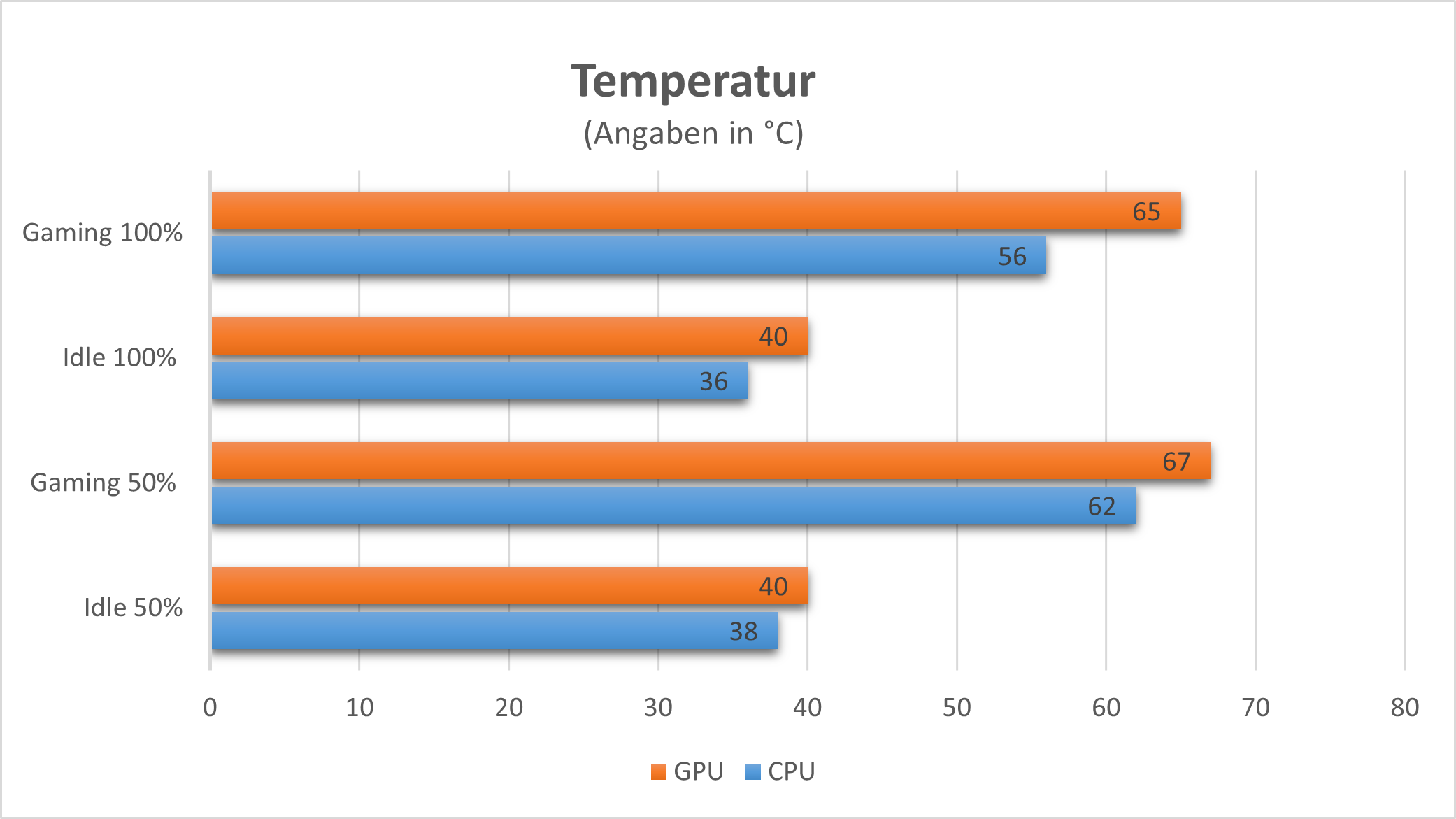 Der dazugehörige Lüfter wurde auf ca. 900 U/min eingestellt. Für die drei Lüfter des NZXT H6 Flow RGB verwenden wir zwei Drehzahlbereiche, einmal 50 % (~650 U/min) und einmal 100 % (~1300 U/min). Alle Drehzahlen sind fest eingestellt. Trotz der geringen Drehzahlen ist zu erkennen, dass sich die Temperaturen im Idle sowie beim Gaming immer im grünen Bereich bewegen. Bei ca. 800 U/min sind die Lüfter Wahrzunehmen und bei steigender Drehzahl immer mehr. Bei voller Geschwindigkeit sind sie deutlich zu hören.