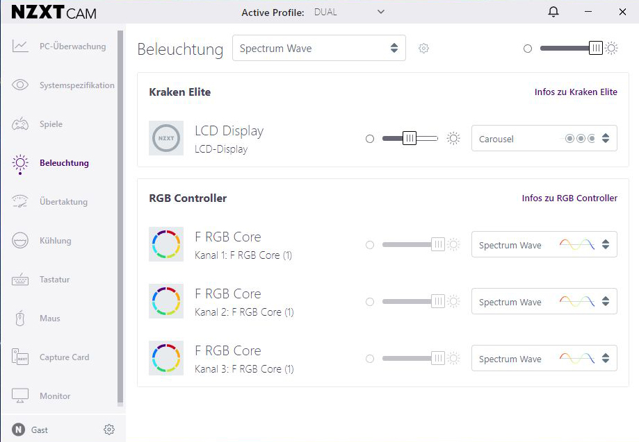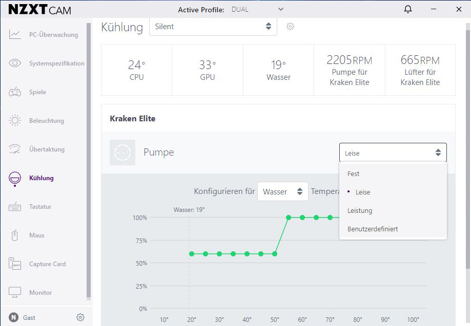 So lassen sich unter dem Reiter „Kühlung“ die Pumpe und jeder einzelne eingebaute Lüfter von NZXT komfortabel unter „Benutzerdefiniert“ steuern, einstellen und als „Aktives Profil“ abspeichern. Dies ermöglicht die Steuerung der Lüfter- und Pumpendrehzahlen und den Betrieb im Stillstandsmodus (Lüfter) bei niedrigen Temperaturen, um Lüftergeräusche zu vermeiden.
