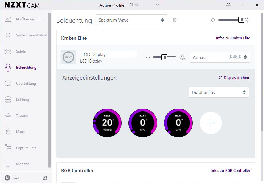 Über das Pull-down-Menü „Beleuchtung“ lassen sich das LCD-Display und die verbauten F120 RGB-Lüfter individuell anpassen. Einzelne Effekte können so einfach abgespeichert werden. Diese können dann bequem und jederzeit unter Add Profile gespeichert, wieder geladen und abgerufen werden.