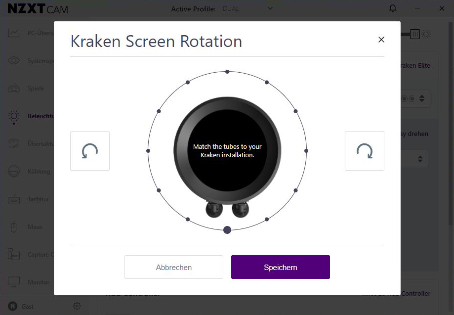 Wie bereits erwähnt, verwendet NZXT eine drehbare Anzeige, die unter dem Reiter „Beleuchtung – LCD-Anzeige“ rechts neben dem Reiter „Anzeige drehen“ eingestellt werden kann. Sie kann von 0 bis -90° eingestellt werden, je nachdem, wie das Pumpengehäuse montiert ist. Aber das ist noch nicht alles. Auch die Farbe kann individuell eingestellt werden.