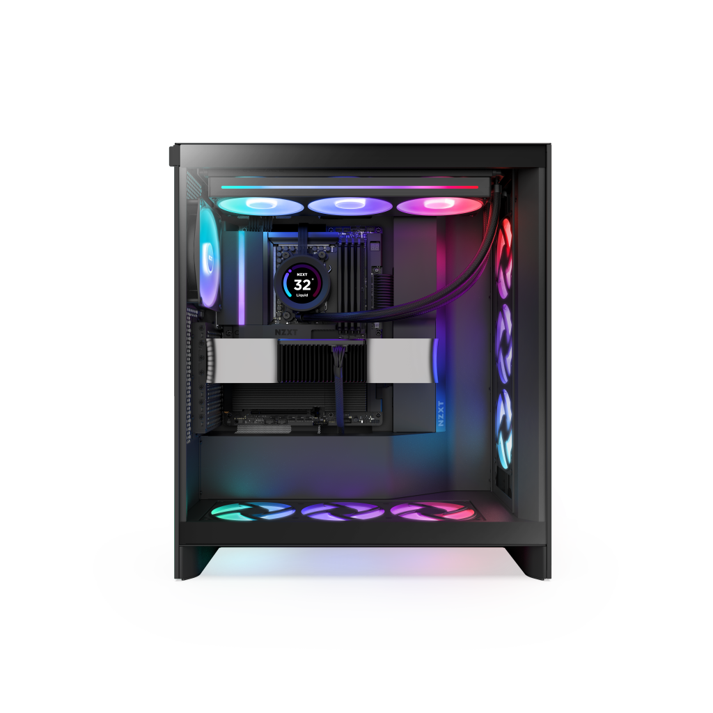 • Integrierte NZXT-RGB-Beleuchtung: Zwei NZXT 8-Pin-Kombilüfteranschlüsse für die einfache Verbindung und Steuerung von NZXT-RGB-Core-Einzelrahmenlüftern und integrierter RGB-Onboard-Zone, gesteuert über NZXT CAM.